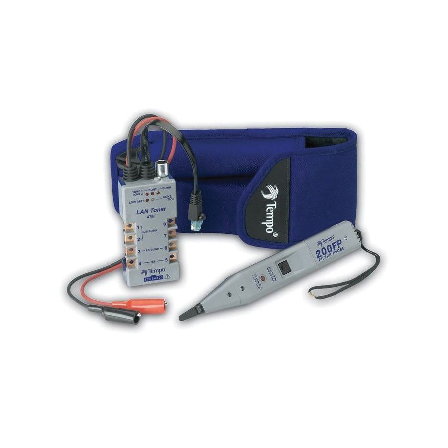 The 802K digital LAN tracing kit is a powerful, unique troubleshooting and tracing solution for LANs and other types of VDV wiring. the industry standard 200FP filter probe is designed to eliminate hum from fluorescent lights and AC power wiring that can obscure tracing tones, and the AT8L LAN toner not only generates multiple tracing tones and provides basic wiring tests, but indicates the presence of 10/100Base-T network service.