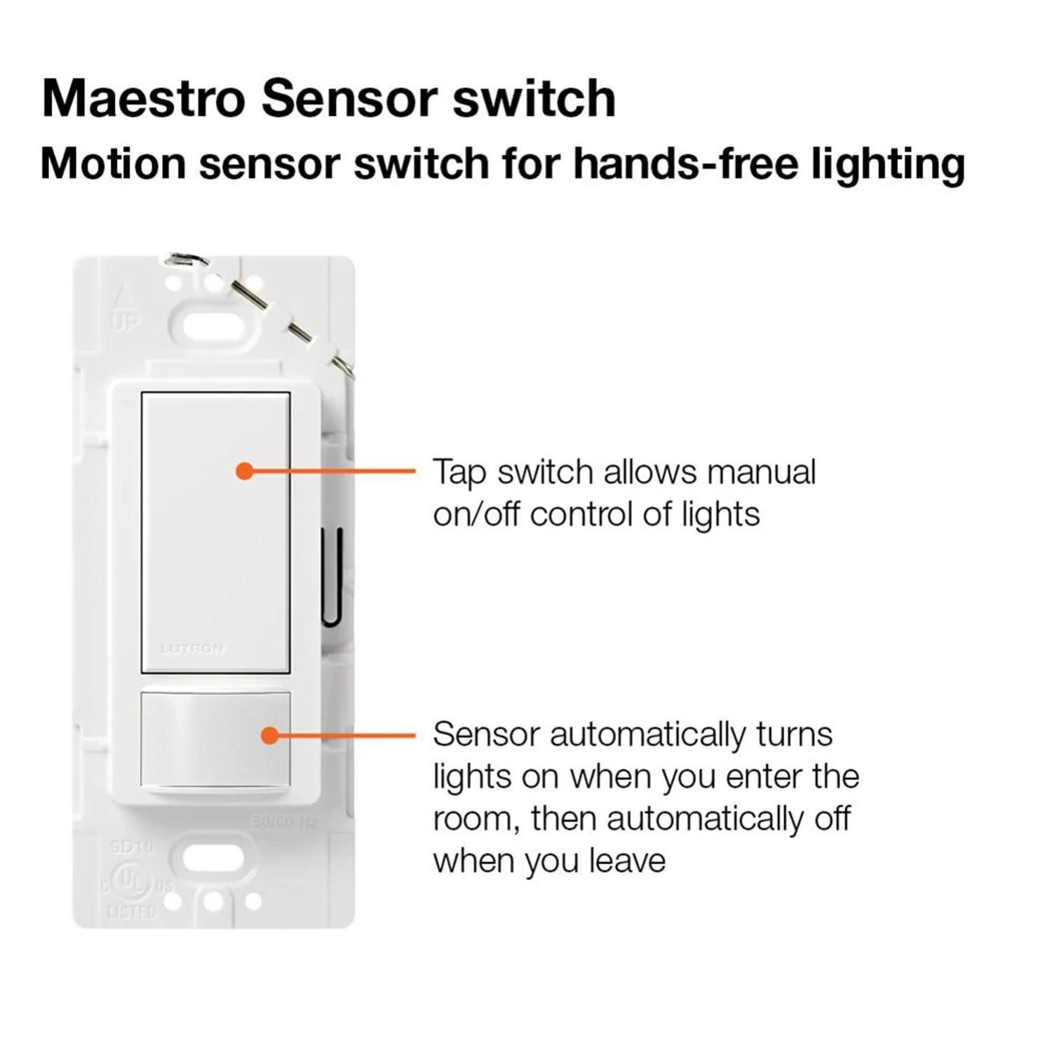 The Lutron Maestro Motion Sensor Switch features Lutron’s advanced motion sensing technology to automatically turn the lights on and off, or manually toggle the lights with the tap switch. The Motion Sensor Switch is rated up to 2A for any lighting type and is single pole only. The passive infrared (PIR) sensor, covered by a tamper resistant lens, detects heat from occupants moving and has a 180-degree field of view (900 sq ft major motion & 400 sq ft minor motion coverage). Equipped with smart ambient light detection (ALD), you can customize your sensor to detect daylight, so lights don't turn on when enough natural light is present in the room. Unlike other manufacturers, Lutron sensors use Cross Correlation Technology (XCT) to also detect fine motion, such as typing at a desk or reading a book – ensuring lights won’t turn off inadvertently when you’re still in the room. Lutron sensors also have an adjustable timeout (1, 5, 15 or 30 minutes) to control how long the lights stay on after leaving the room. Switch the sensor to vacancy mode to meet Title 24 requirements: lights only turn on with a manual press of the tap switch but automatically turn off if the sensor no longer detects motion. The sensitivity of the PIR sensor can also be changed so it only detects larger motion Available in 10+ colors. Pairs perfectly with Lutron Claro wall plates for consistent color matching (sold separately).