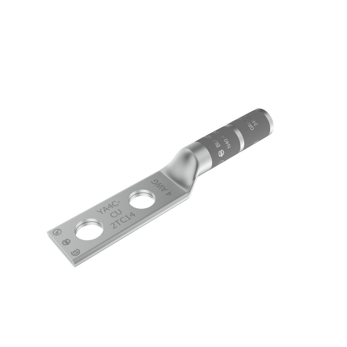 BURNDY® HYLUG™ Compression Lug, 2-Hole, Series: YA-2N, Stranded Copper Conductor, 4 AWG Conductor, Die Code: 8, 600 VAC to 35 kV, 1/2 in Stud, Standard Tongue, 0.81 in W Tongue, 4.45 in Overall Length, Long Barrel, 1.12 in L Barrel, 0.83 in W Pad, 1-3/16 in L Wire Strip, Tin-Electro Plated, 1-3/4 in Hole Spacing, 90 deg C, 0.52 in Mounting Hole, Tin Plated Copper, Gray