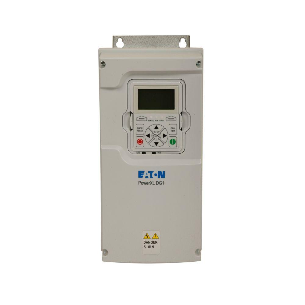 EATON PowerXL™ Variable Frequency Drive, 3-Phase Adjustable General Purpose, Series: DG1, 380 to 500 VAC, 9 A, 5 hp, 6.61 in Width, 9.63 in Depth, 16-1/2 in Height, NEMA 1/IP21 Enclosure, LCD Display