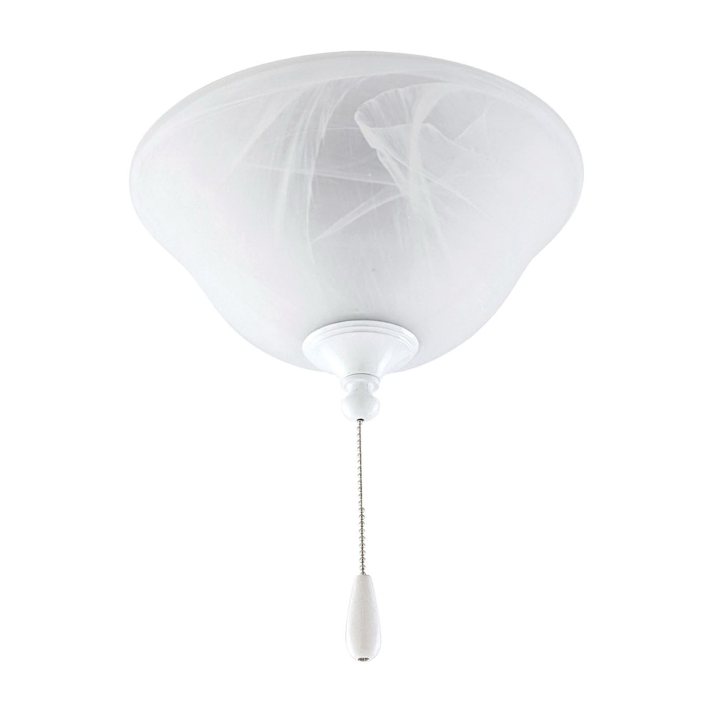 White three-light fan kit with alabaster style glass bowl. Elegant alabaster glass conceals light bulbs and casts an inviting illumination in any size room. Corresponding pull chain features Chrome finish with a white fob. Universal style lets you use with any indoor fan that accept an accessory light. Quick-connect wiring makes the installation process quick and easy.