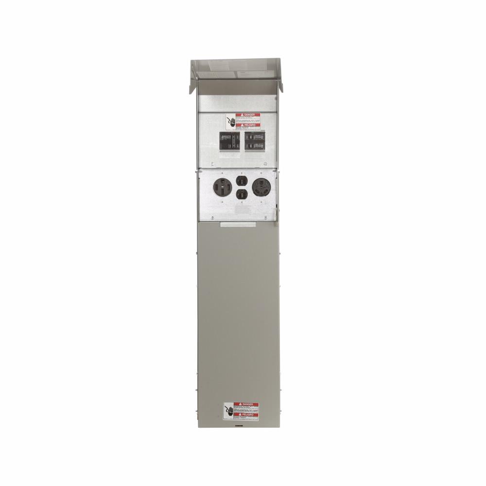 EATON Unmetered Power Outlet Pedestal, 6-Circuit, 125/250 VAC, 20/30/50 A, NEMA 14-50R/NEMA 5-20R2GFI/NEMA TT-30R Receptacle, Non-Ground Fault Circuit Breaker Type, Top Feed, NEMA 3R, Galvanized Steel, Surface Mount