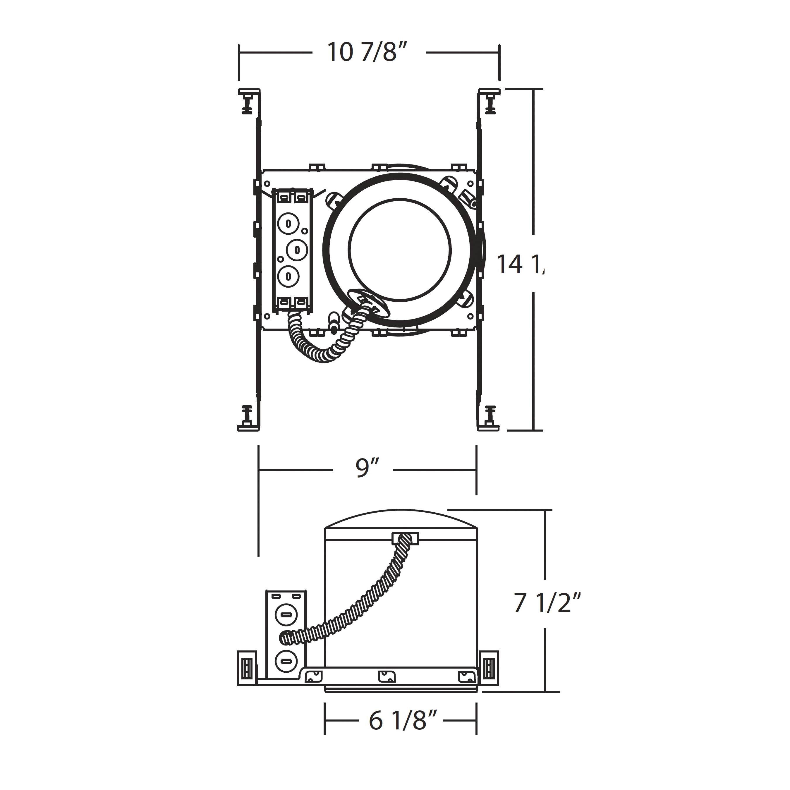 This 6 in IC rated housing is suitable for new construction in residential and commercial applications and for direct contact with insulation. The airtight housing limits the exchange of air between ceiling plenum and heated/cooled areas. Integral thermal guards protect against improper lamping and with lamp wattage ratings and apertures based off trim selection. The housing adjusts from 1/2 to 1-1/2 in to accommodate ceiling thickness and its 7-1/2 in height allows it to be used in 2 x 8 in joist construction.