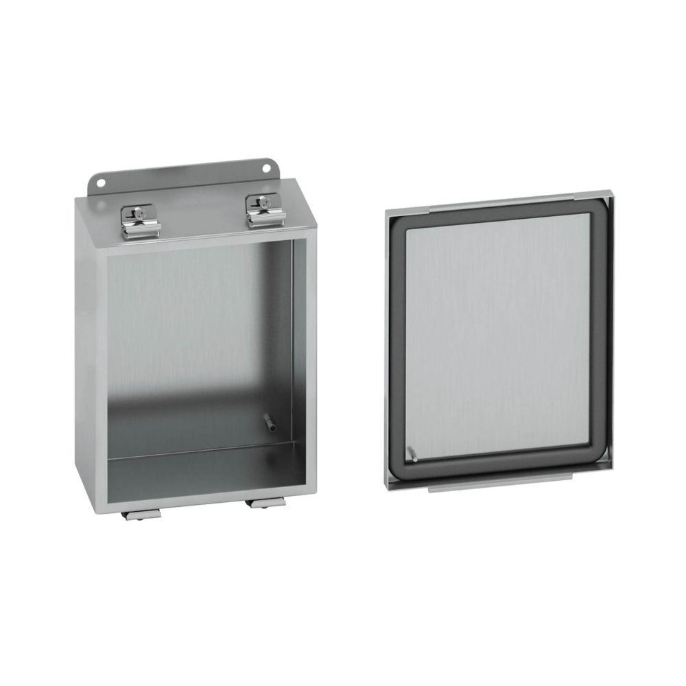 B-Line JIC Enclosure, 6 in Width, 4 in Depth, 6 in Height, NEMA 4X, Lift-Off Cover, 4.87 in W x 4.87 in H Panel, External Feet/Wall Mount, 304 Stainless Steel, Smooth Brushed