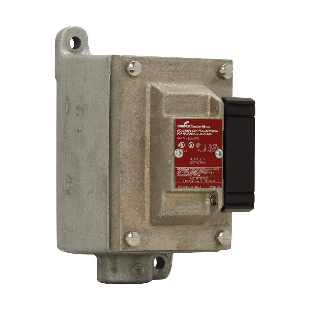 Crouse-Hinds FlexStation™ Pushbutton Control Station, 1-Gang Factory Sealed Heavy Duty Through-Feed, Series: EDS, 600 VAC, Side Rocker Handle Actuator, 3/7B/7C/7D/9E/9F/9G NEMA Rating, Feraloy® Iron Alloy, Electro-Galvanized/Aluminum Acrylic Painted, 5-7/8 in L x 3-1/2 in W x 3-1/16 in H Dimensions