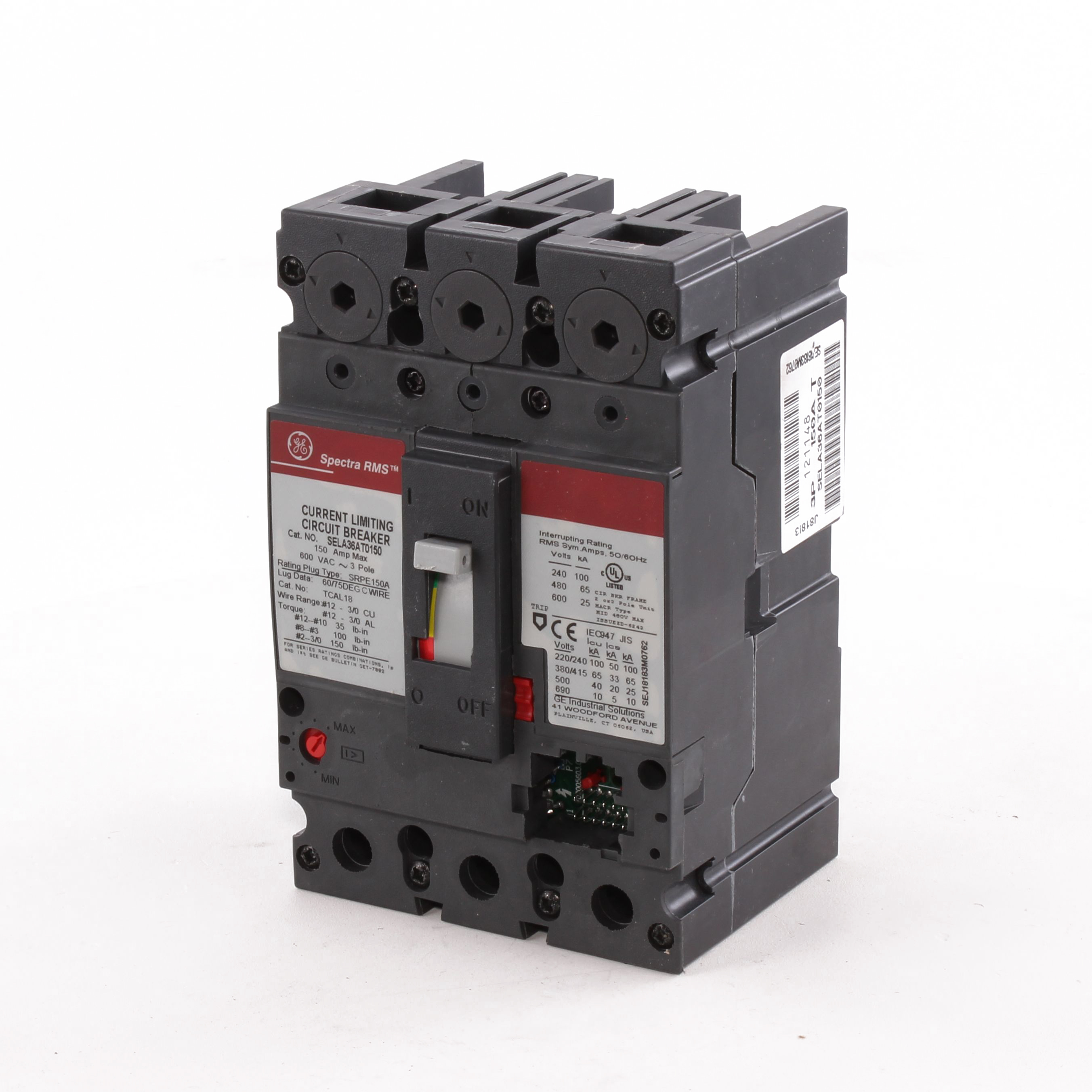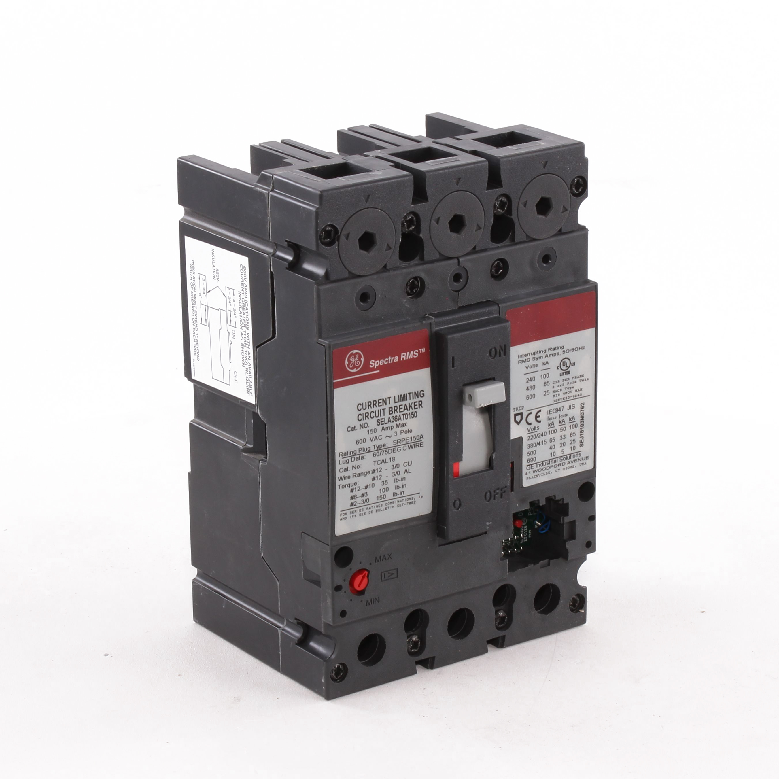 GE Spectra RMS® SELA36AT0150 Type SEL Standard Continuous Load Current Limiting Molded Case Circuit Breaker With Tracking Short Time, 600 VAC, 150 A, 25/65/100 kA Interrupt, 3 Poles, Electronic Trip