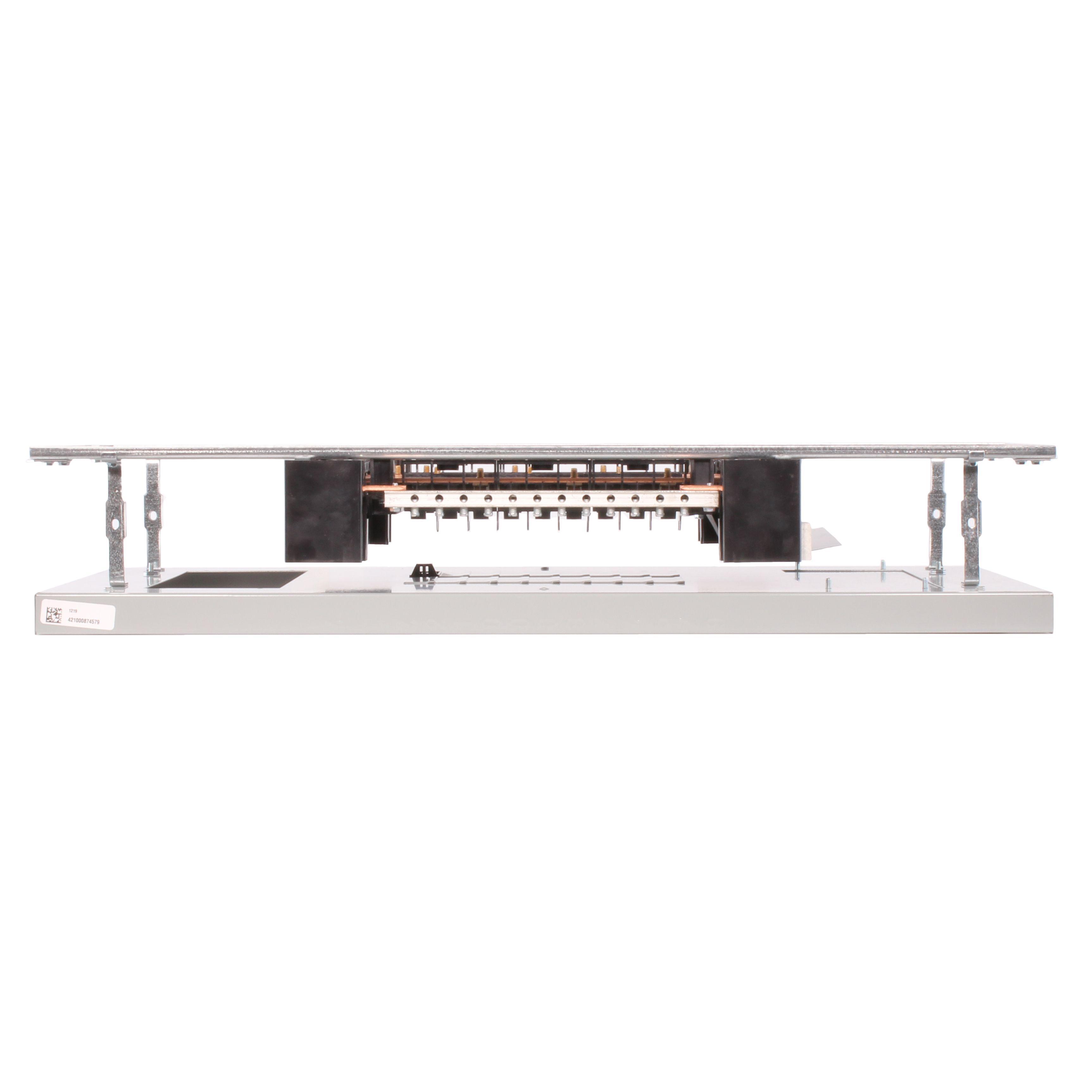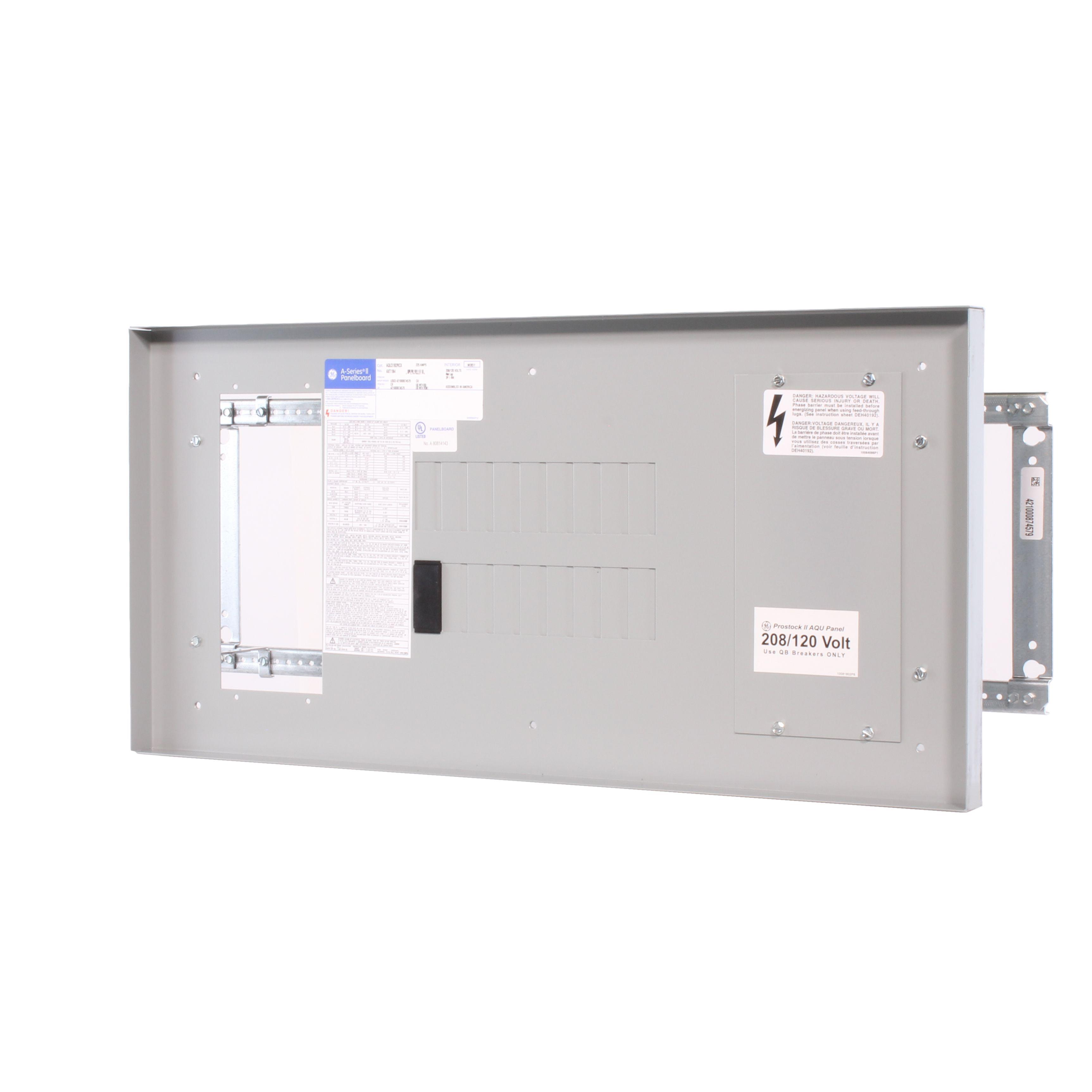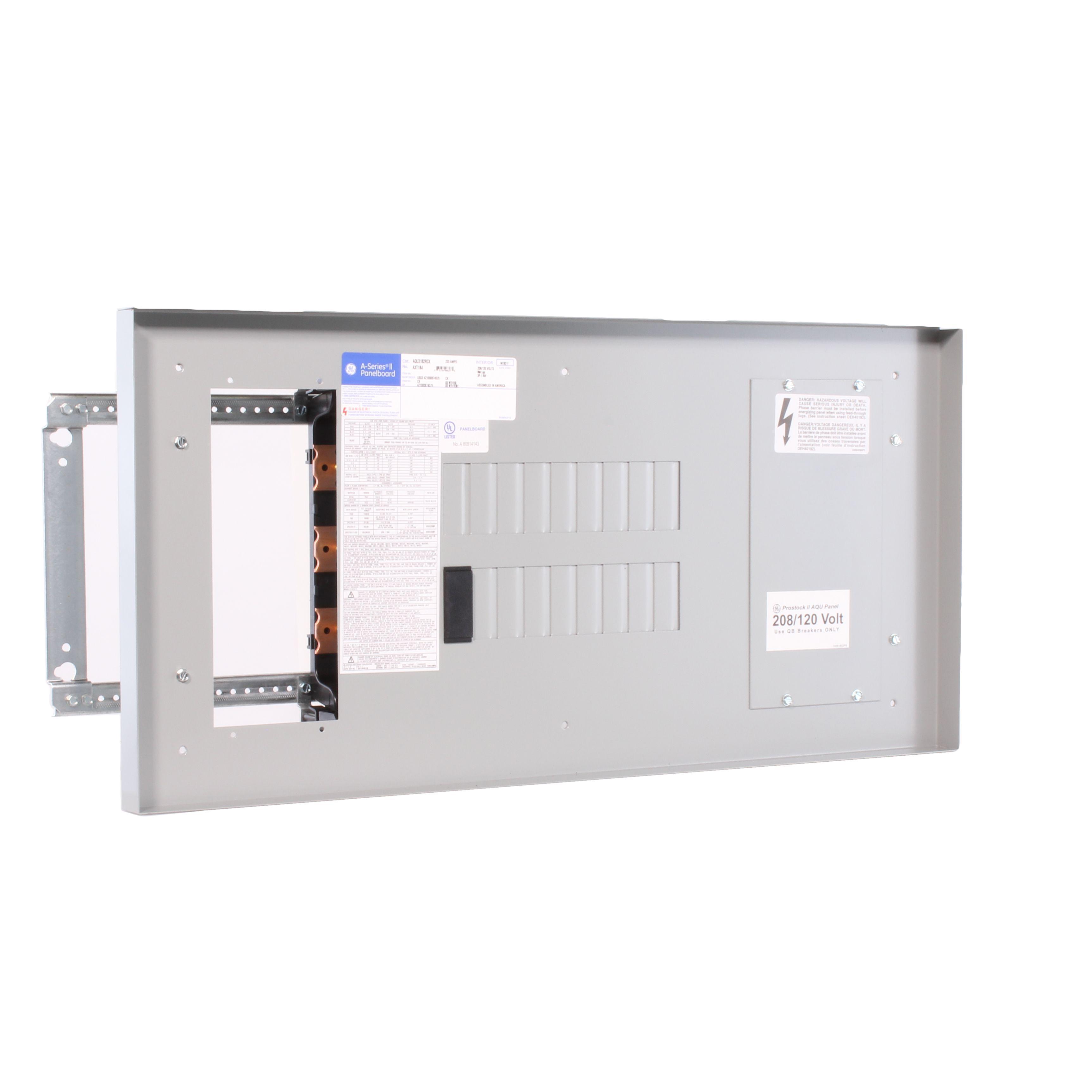 GE A-Series™ II Pro-Stock™ Panelboard Interior, 3-Phase Type AQU Feed-Through, 240 VAC, 225 A, 50/60 Hz Frequency, 65/200 kA Interrupt, 18 Spaces, 100000 A Short Circuit, TQD/THQD/SF/FE Breaker, Bolt-On Breaker Mounting, Copper Bus, Surface Mounting, NEMA 1/3R/12 Enclosure, 20 in W x 5.81 in D x 37.5 in H Dimensions