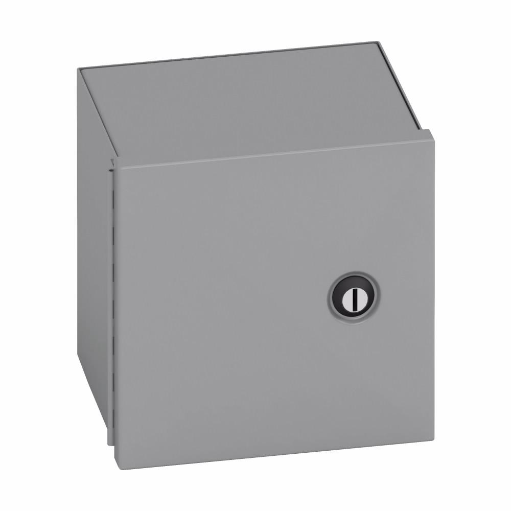 B-Line Panel Enclosure, D70 Subclass Small, 6 in Width, 4 in Depth, 6 in Height, NEMA 1/IP30 NEMA Rating, Continuous Hinged Cover, 4-1/4 in W x 4-1/4 in H Panel, Lock: Flush Coin Latch, Wall Mounting, Carbon Steel, Polyester Powder Coated, Gray