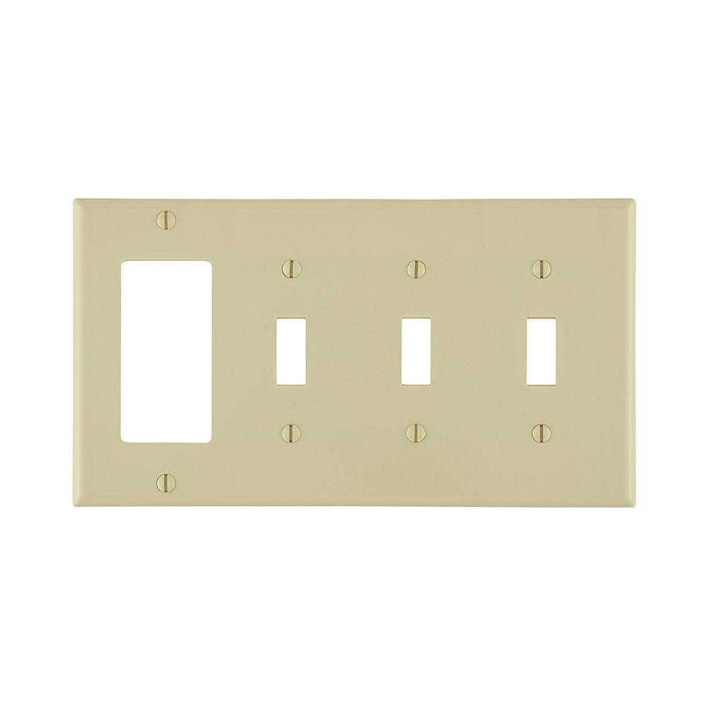 Leviton®, Decora®, P326-I, Combination Wall Plate, Standard Size, 4 Gangs, 8.19 in W x 4.5 in H Size, 0.942 in H x 0.406 in W Toggle, Decorator/GFCI Cutout, Surface Mounting, 0.22 in Thickness, Thermoset, Ivory, Smooth