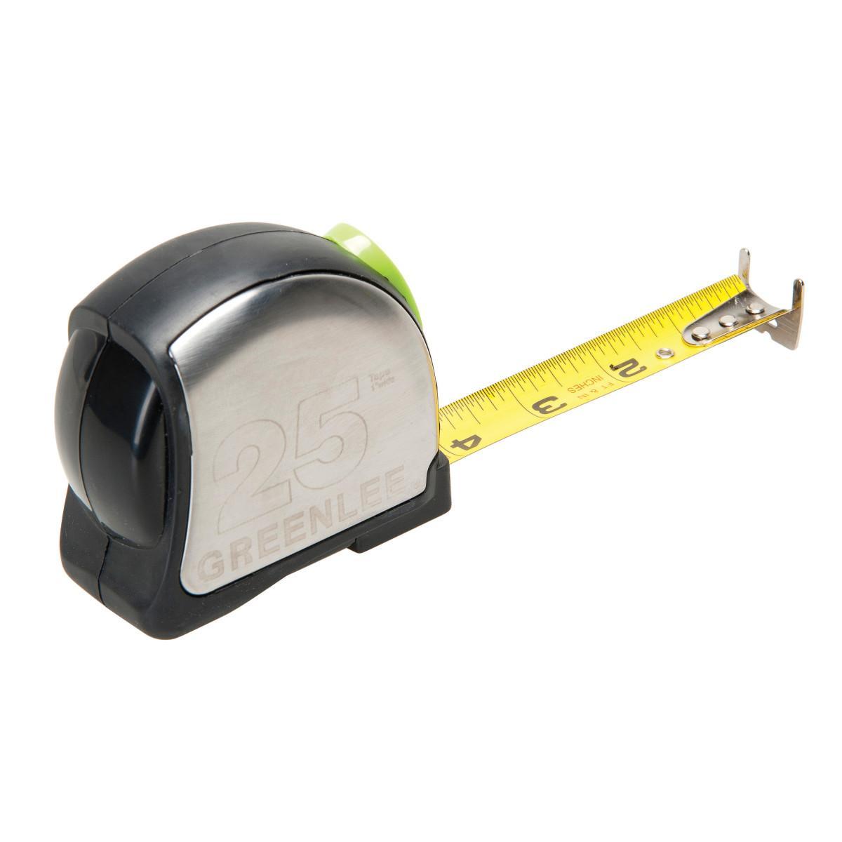 Greenlee® Measuring Tape, Pop, Measuring System: Imperial, 25 ft Blade Length, 1 in Blade Width, Steel Blade, 16 in/19.2 in Stud Markings, 6 ft Standout, Power Return Rewind, Click Locking, Multi-Riveted/Double Tang Hook, Closed Case, ABS Case