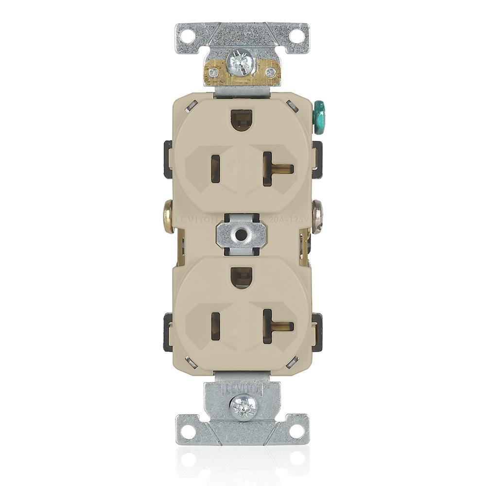 Leviton®, BR20-I, Straight Blade Receptacle, 1-Phase Duplex Heavy Duty, 125 VAC, 20 A, 1 hp, 2 Pole, 3 Wires, NEMA 5-20R NEMA Rating, Commercial Grade, -40 to 60 deg C, Back/Side Wire Terminal, Nylon, Ivory, 46 in H x 1.56 in W x 19 in D Dimensions