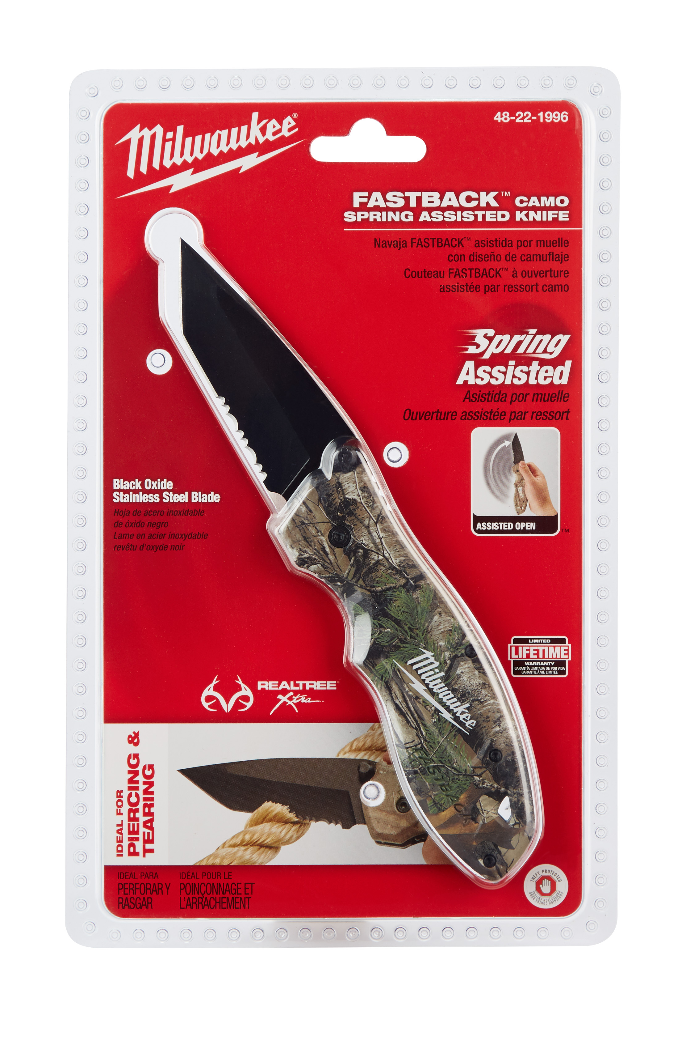 The Milwaukee® FASTBACK™ camo spring assisted knife combines jobsite performance with the outdoorsman lifestyle. This knife features a durable black oxide coated stainless steel blade and spring assisted opening for fast access. The handle features a RealTree Xtra® camo finish and reversible wire form belt clip.