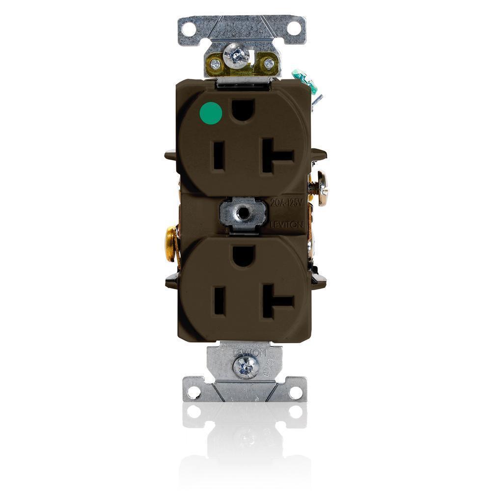 Leviton® 8300-H Straight Blade Duplex Receptacle, Heavy Duty Slim Body, 125 VAC, 20 A, 1 hp, 2 Pole, 3 Wires, NEMA 5-20R NEMA Rating, Hospital Grade, NEMA WD-1/WD-6 Enclosure, -40 to 60 deg C, Back/Side Wire Terminal, Thermoplastic, Brown, 4.06 in H x 1.51 in W x 1.18 in D Dimensions