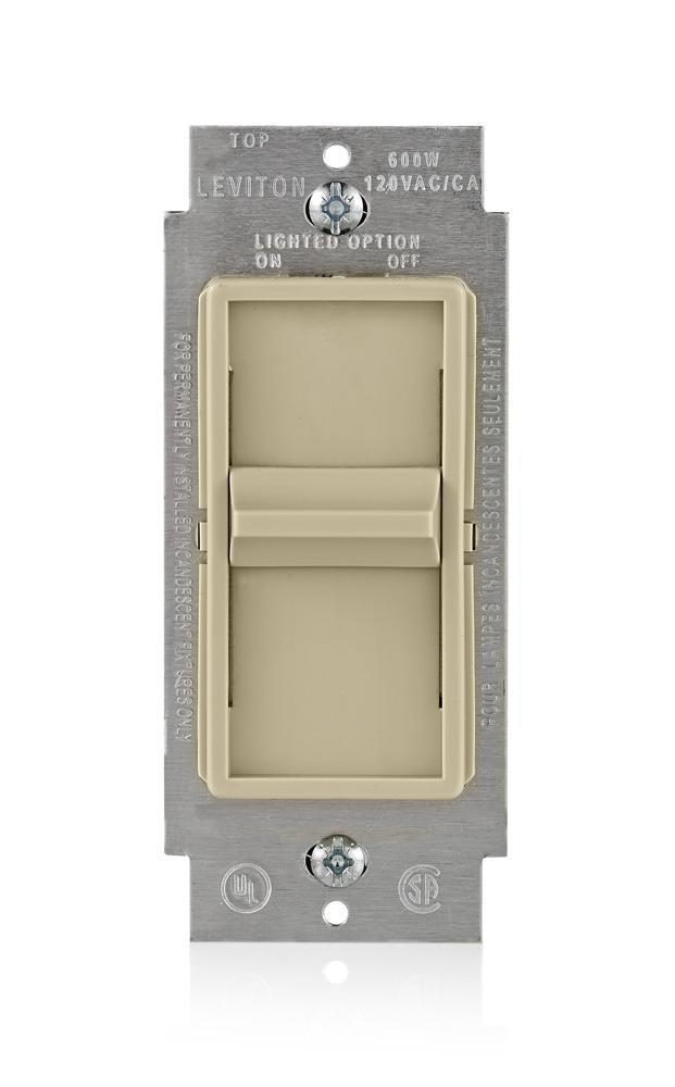 Leviton® SureSlide® Dimmer Switch, Electro-Mechanical Illuminated, 120 VAC, 600 W, 60 Hz, 1 Poles, Incandescent Lamp, Operation Mode: Standard On/Off, Slide to Off, Wall Mount, 0 to 55 deg C, Ivory, 4.13 in H x 1.73 in W x 1.34 in D