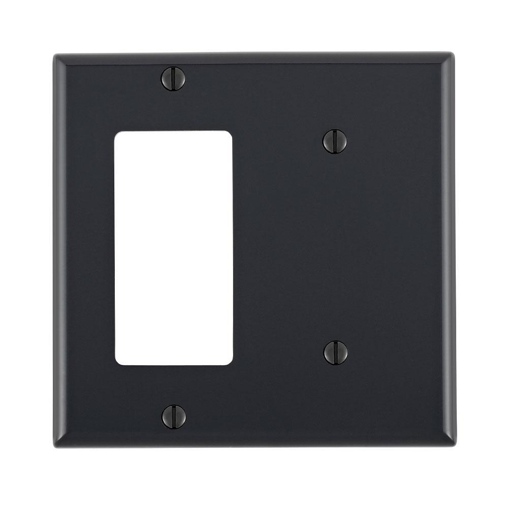 Leviton®, Decora®, 80708-E, Combination Wall Plate, Blank Standard Size, 2 Gangs, 4.56 in W x 4.5 in H Size, 0.942 in H x 0.406 in W Decorator/GFCI Cutout, Surface Mounting, 0.22 in Thickness, Thermoplastic, Black, Smooth