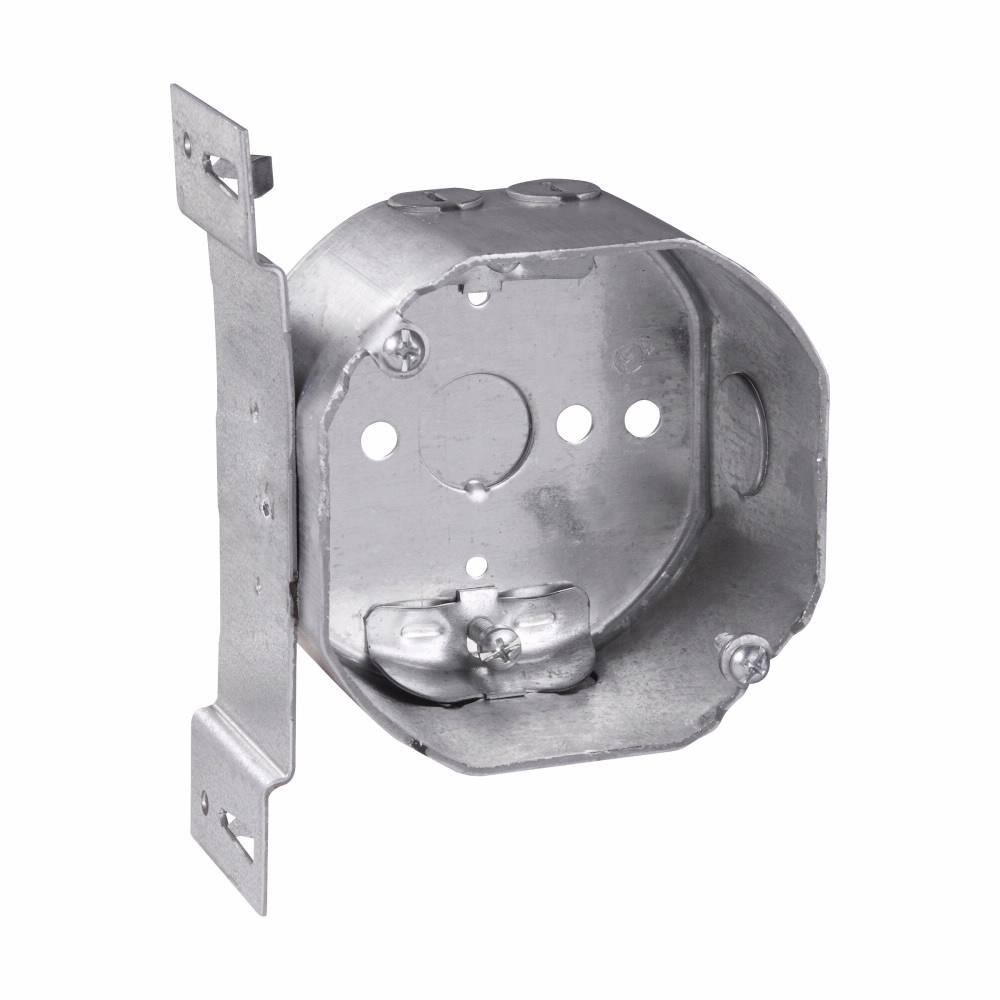 Crouse-Hinds series steel octagon outlet boxes, covers, adjustable bar hangers and ceiling pans can be used in the installation of ceiling or wall lighting fixtures or as a junction box. A variety of labor-saving mounting brackets are available that allow for easy positioning of the octagon box along studs or joists. The adjustable bar hangers allow the octagon box to be located anywhere along the length of the bar.