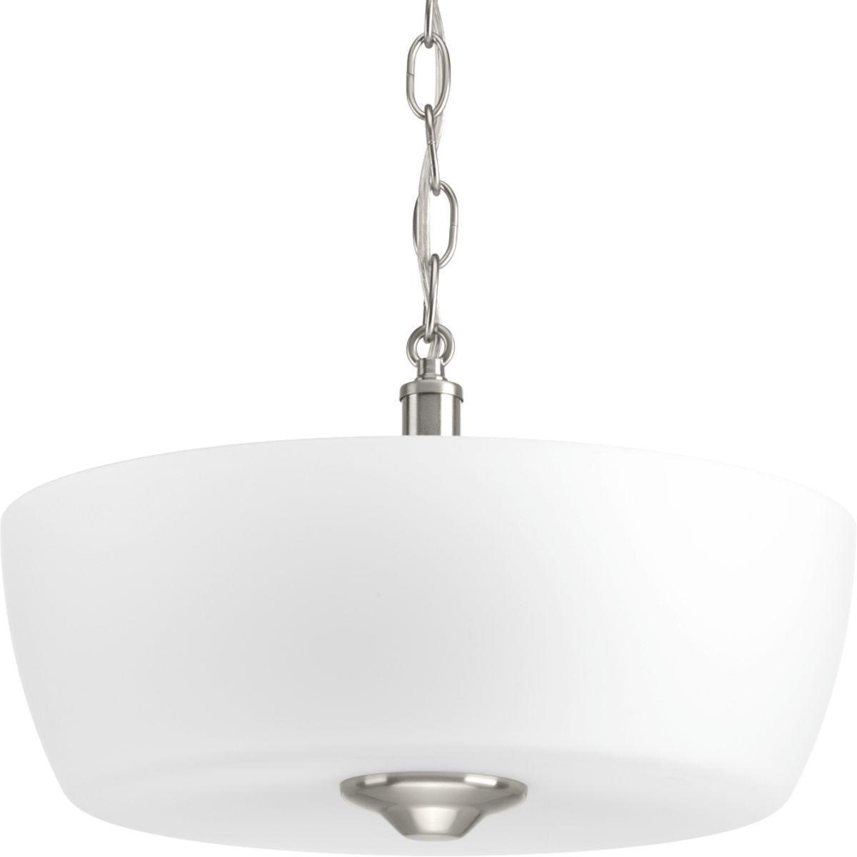 The Leap collection features etched glass shades that are slightly larger in scale to complement contemporary design trends. This 2-light semi flush convertible is finished in brushed nickel.