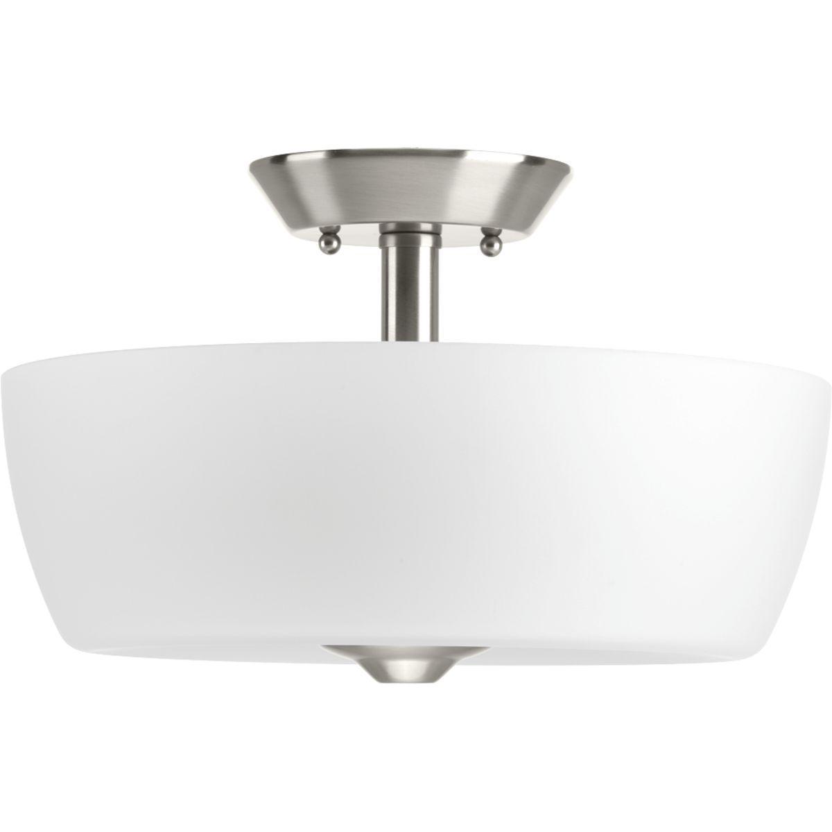 Progress Lighting® Semi-Flush Mount Lighting, Modern/Transitional, Series: Leap, 120 VAC, A19 Incandescent Lamp, 100 W Lamp, E26 Medium Lamp Base, 2 Lamps, Etched Glass Shade, Pre-Wired Cord, Ceiling Mount, Steel Housing, Brushed Nickel Plated Housing, 14 in W x 8-3/4 in H