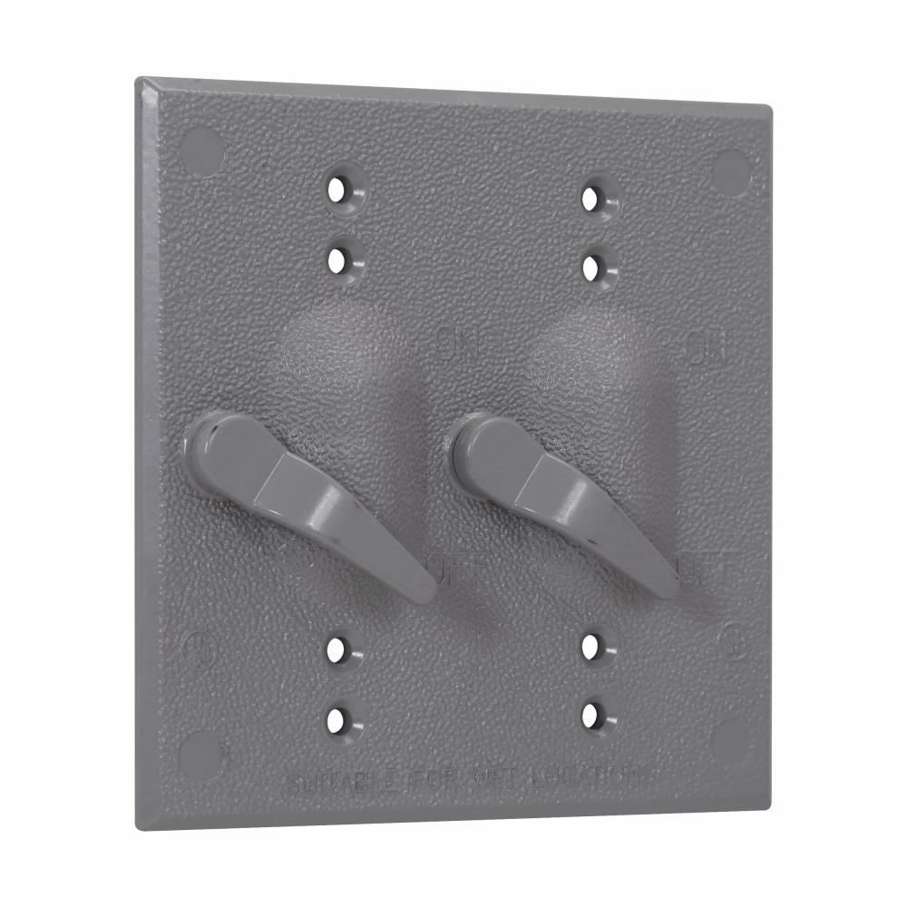 EATON Crouse-Hinds Thepitt® Toggle Switch Outlet Cover, Weatherproof, 2 Outlets, 2 Gangs, 4-5/8 in Length, 4.562 in Width, Square, Surface Mount, Stamped Aluminum, Powder Coated, Gray