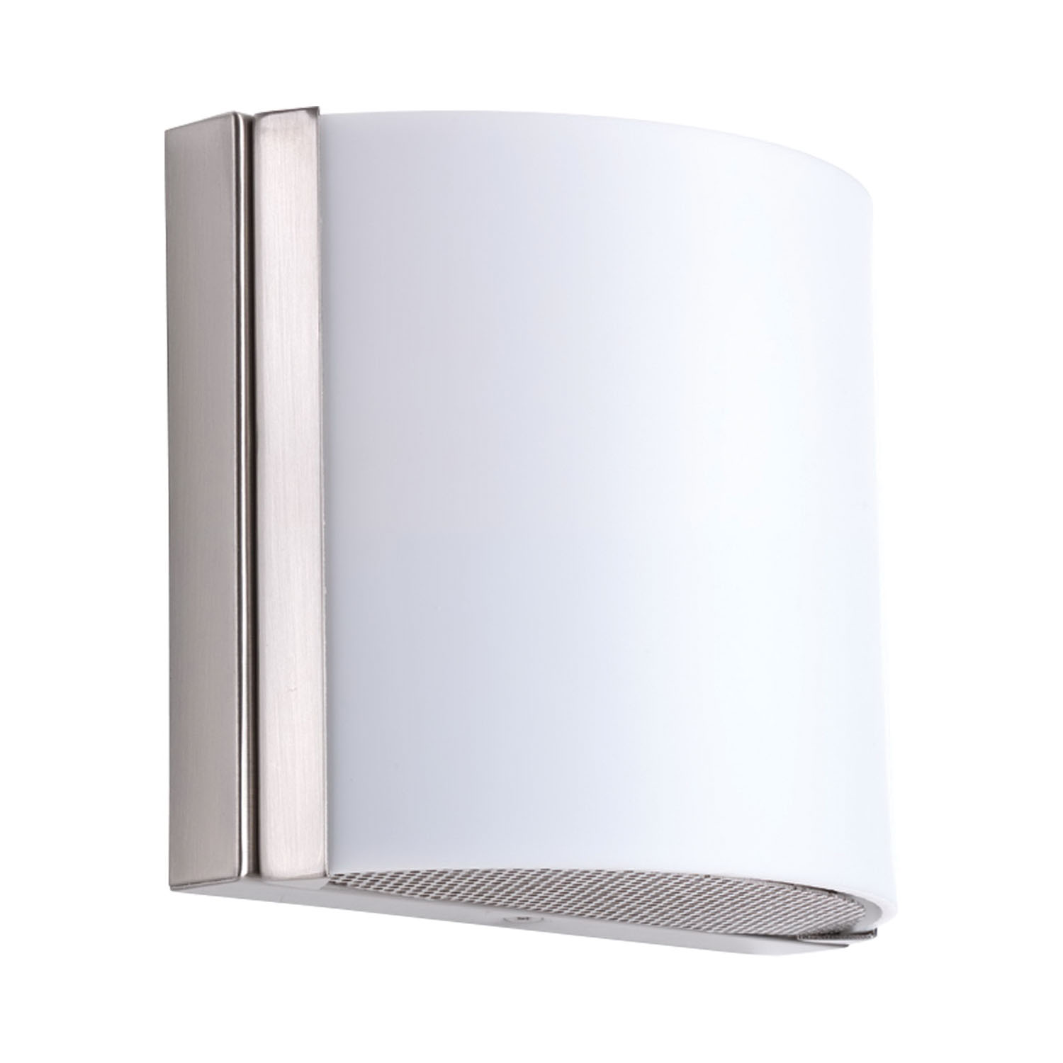 Progress Lighting® Progress LED Wall Sconce, Casual/Traditional, Series: Arch, 120 VAC, 0.142 A, LED Lamp, 17 W Lamp, 1 Lamp, 60000 hr Average Life, Gray Light, 3000 K Color Temperature, 90 CRI, White Acrylic Shade, 1211 Lumens, Wall Mounting, Steel Housing Material, Brushed Nickel Plated Housing Finish, 6 in H x 7-1/4 in W x 3 in D