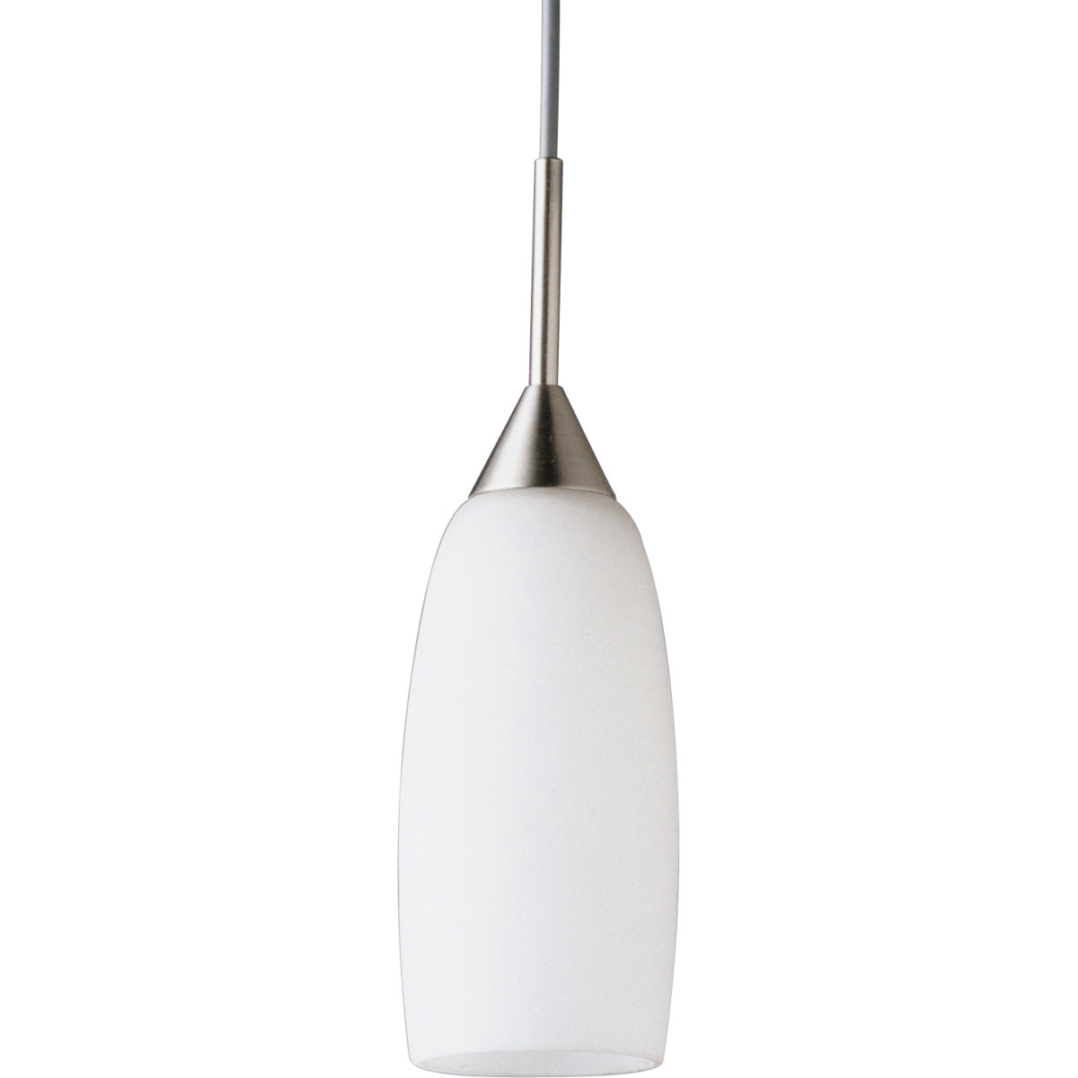 Progress Lighting® Mini Pendant, Contemporary/Soft, Series: Legend, 12 VAC, Incandescent/Halogen Lamp, 35 W Lamp, Bi-Pin GY6.35 Lamp Base, 1 Lamp, Tulip White Glass Shade, Ceiling/Stem Mounting, Steel Housing Material, Brushed Nickel Housing Finish, 2-3/8 in Dia x 72 in H Dimensions