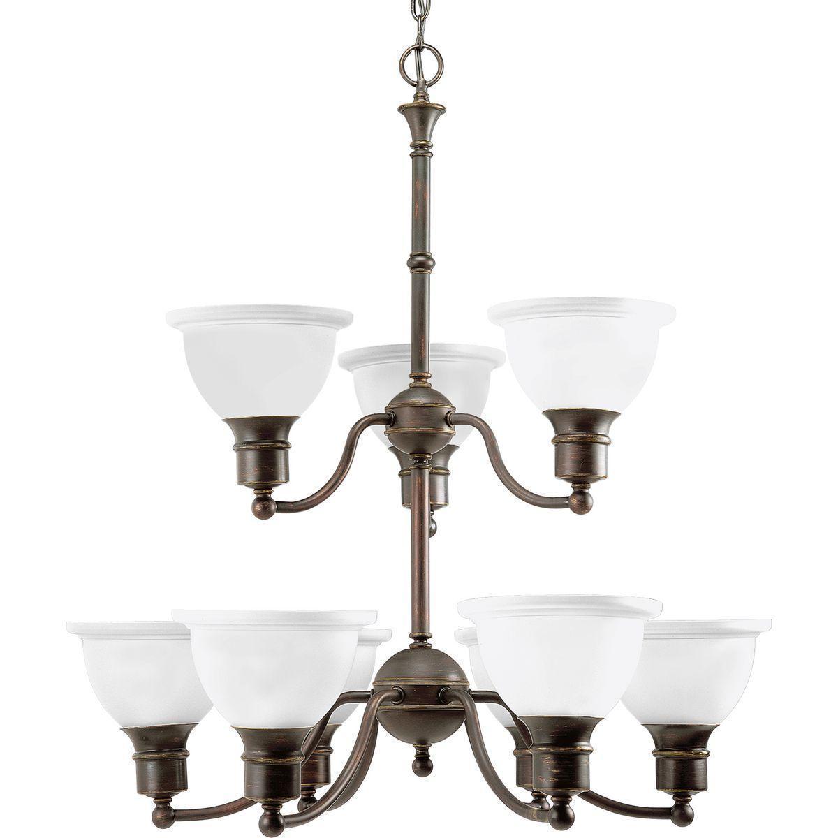 Progress Lighting® Chandelier, Series: Madison, 120 VAC, A19 Incandescent Lamp, 100 W Lamp, Medium, 9 Lamps, Brown Light, Etched Glass Shade, Ceiling/Chain Mount, Steel Housing, Antique Bronze/Painted Housing, 107 in L x 29 in W x 32-3/8 in H