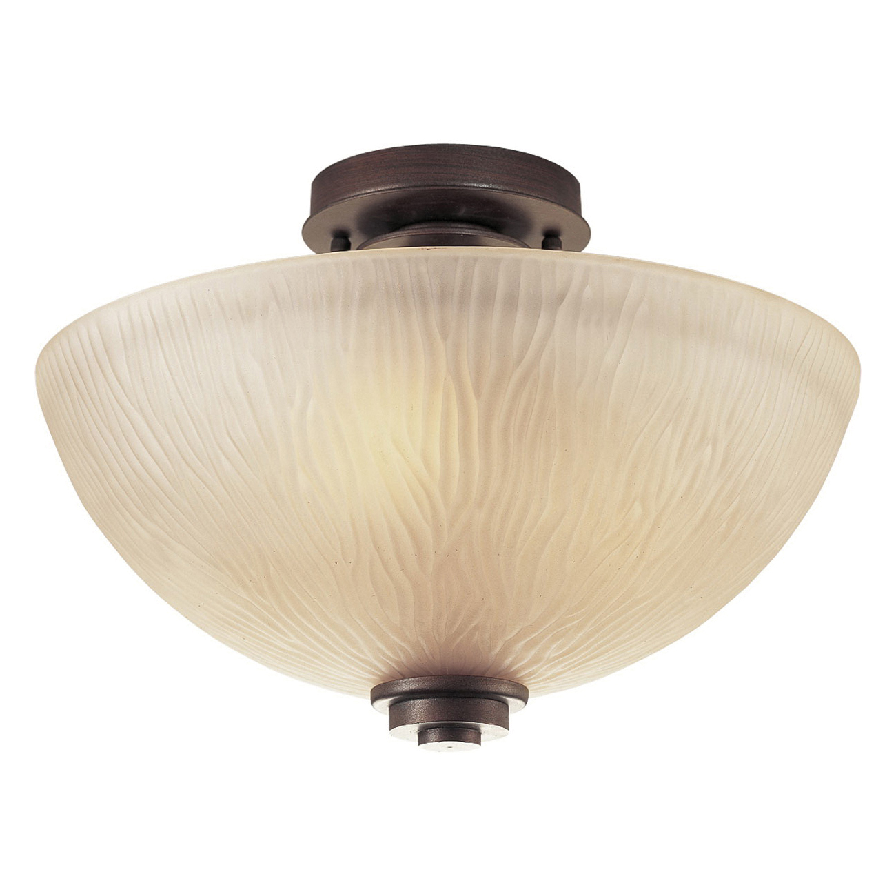 Three-light semi-flush with light topaz glass in a deep-toned heirloom finish. Fixture is part of the clean-lined and rustic Riverside collection, which utilizes a Craftsman approach to modern style with simple and uncomplicated detailing.