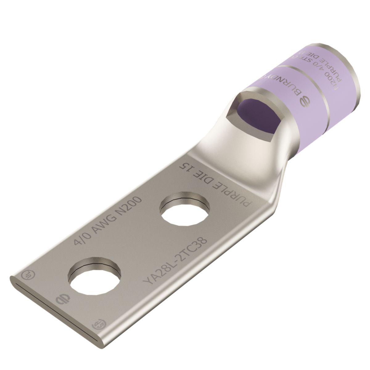 BURNDY® HYLUG™ Compression Lug, 2-Hole, Series: YA-L-2TC, Stranded Copper Conductor, 4/0 AWG Conductor, Die Code: 15, 600 VAC to 35 kV, 3/8 in Stud, Standard/Straight Tongue, 1.02 in W x 0.14 in THK Tongue, 3.22 in Overall Length, Chamfered/Short/Skived/Standard Barrel, 0.69 in OD x 0.88 in L Barrel, 1-1/8 in L Wire Strip, 1 in Stud Hole Spacing, 90 deg C, Tin Plated Copper, Purple