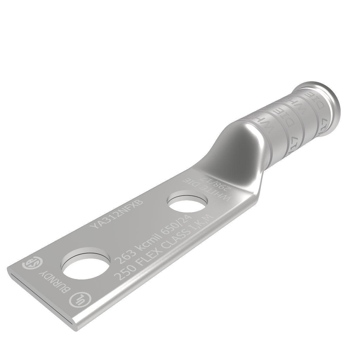 BURNDY® HYLUG™ Compression Lug, 2-Hole, Series: YAV-2TC-FXB, Stranded Copper Conductor, 4/0 AWG Conductor, Die Code: 15, 600 VAC to 35 kV, 3/8 in Stud, Standard Straight Tongue, 1.14 in W x 0.14 in THK Tongue, 4.2 in Overall Length, Bell End/Long Barrel, 1.77 in L Barrel, Specifications: 1-7/8 in L Wire Strip, 1 in Hole Spacing, 90 deg C, Electro-Tin Plated Copper, Purple