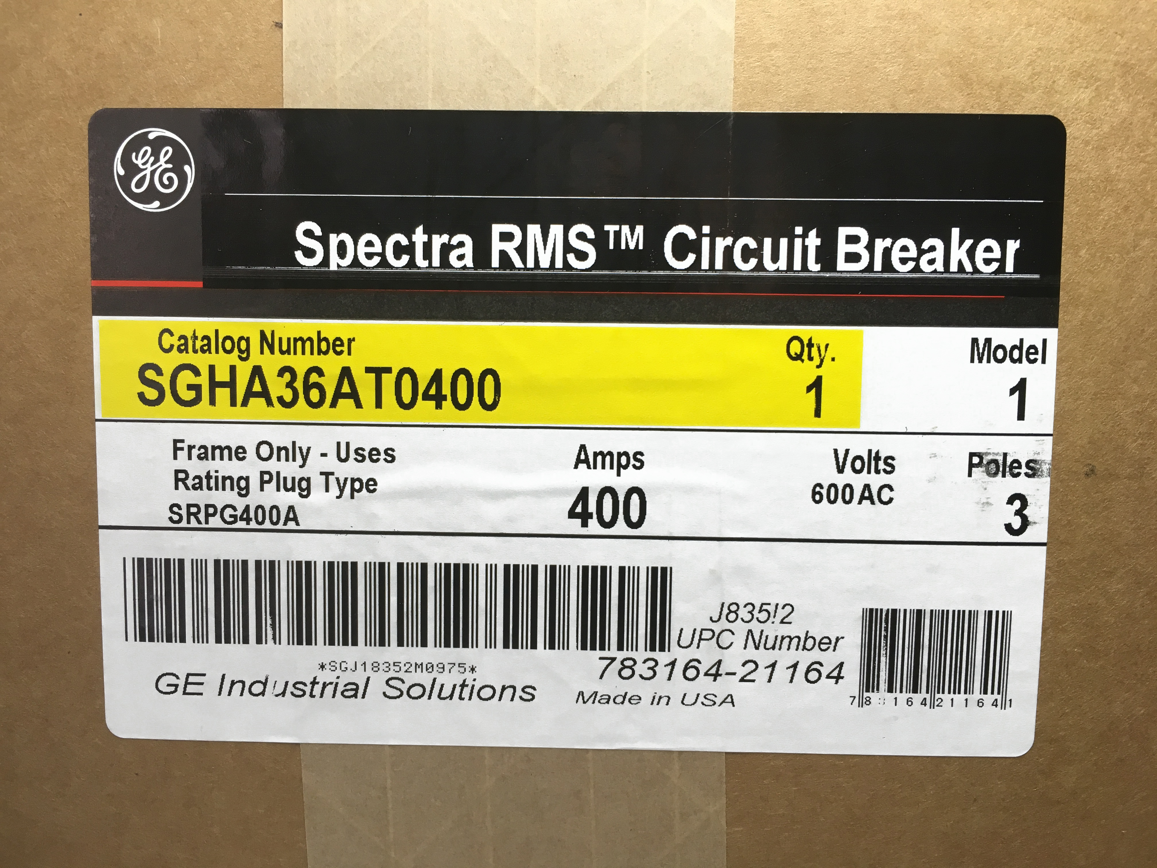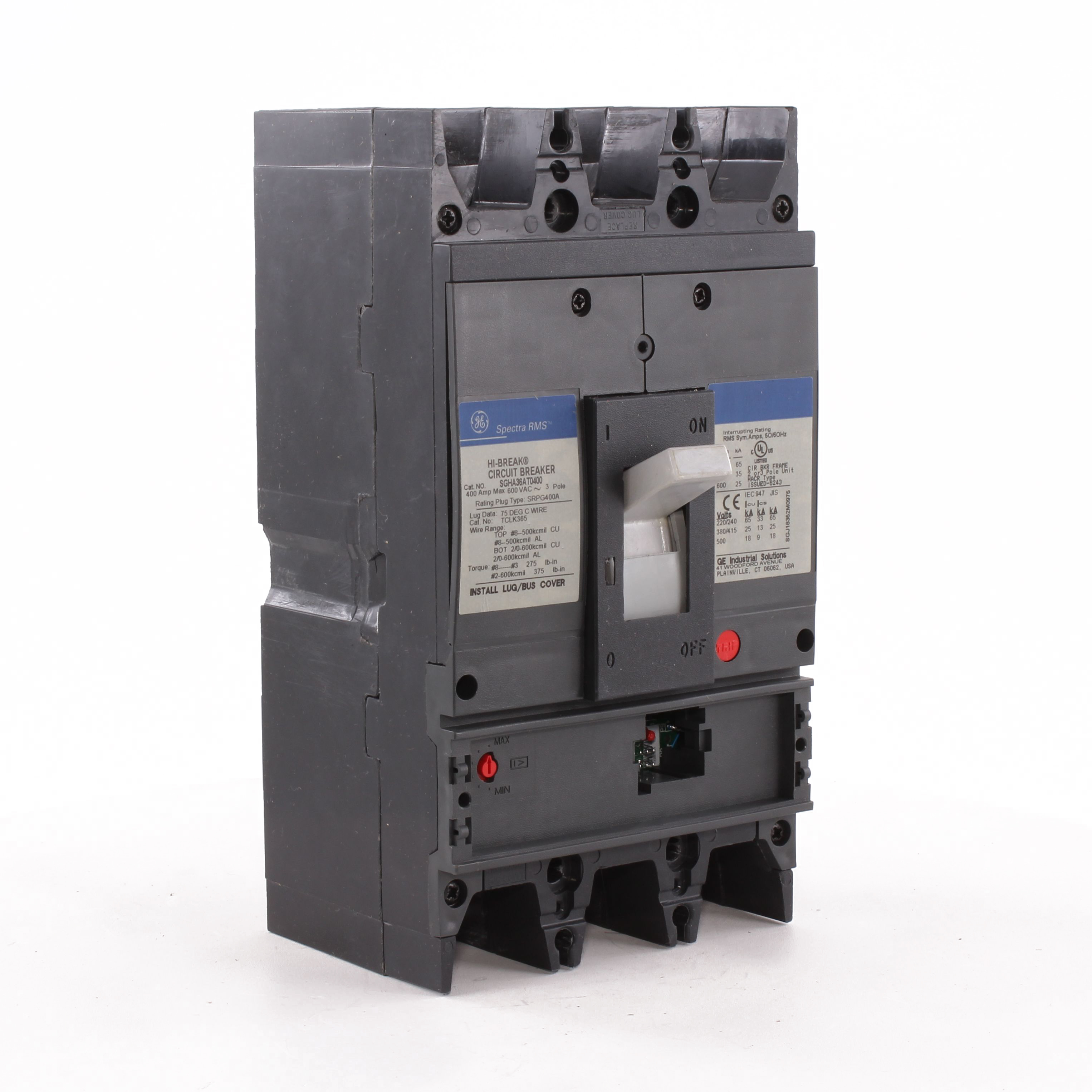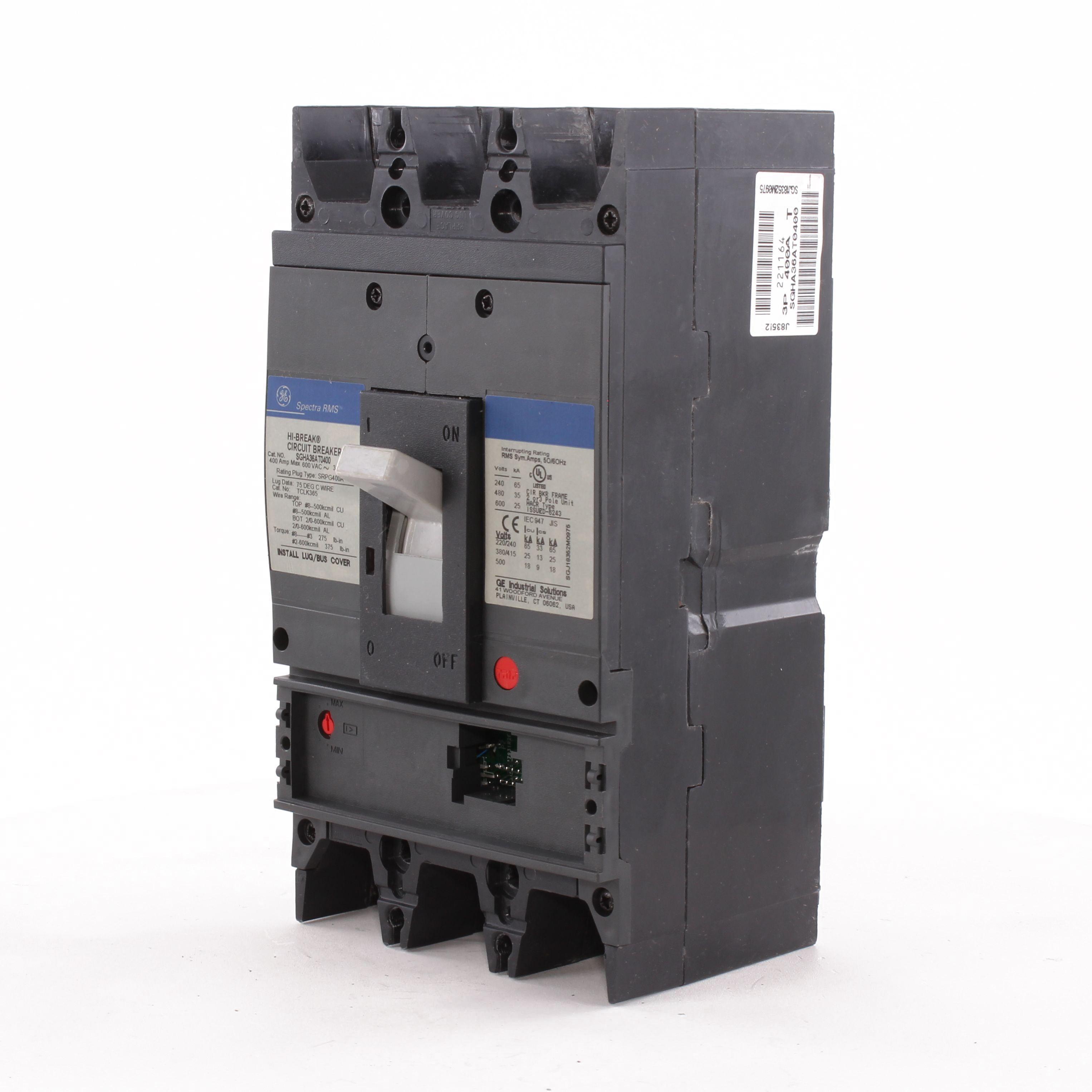 GE Spectra RMS™ SGHA36AT0400 Type SGH Standard Continuous Load Current Limiting Molded Case Circuit Breaker, 600 VAC, 400 A, 25/35/65 kA Interrupt, 3 Poles, Electronic Trip