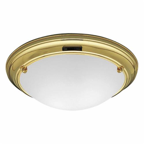 Progress Lighting® Eclipse™ Flush Mount Fixture, Classic Traditional, 120 VAC, A19 Incandescent Lamp, 60 W Lamp, Medium Lamp Base, 2 Lamps, Gold Light, White Glass Shade, Glass Lens, Ceiling Mounting, Steel Housing Material, Brass Housing Finish, 4-5/8 in H x 15-1/4 in W Dimensions