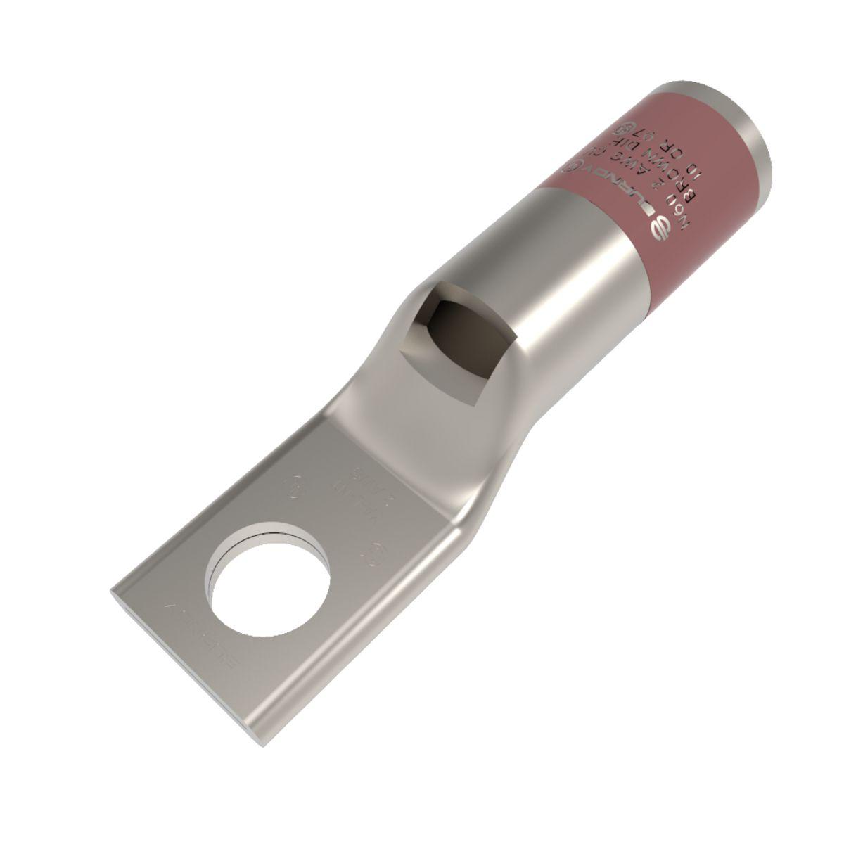 BURNDY® HYLUG™ Compression Lug, 1-Hole, Series: YA-L-NT, Flexible/Stranded Copper Conductor, 2 AWG Conductor, Die Code: 10, 600 VAC to 35 kV, 1/4 in Stud, Narrow/Straight Tongue, 0.5 in W x 0.11 in THK Tongue, 1.8 in Overall Length, Chamfered/Narrow/Standard Barrel, 0.88 in L Barrel, 15/16 in L Wire Strip, Electro-Tin Plated, 90 deg C, Copper, Brown