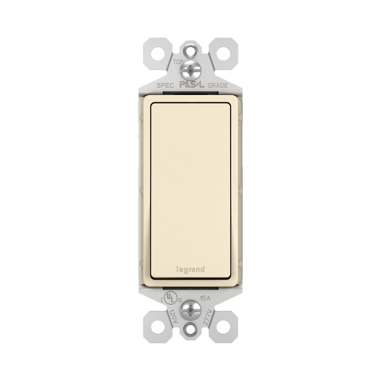 Pass & Seymour® TradeMaster® Decorator Switch, Series: Radiant®, 120/277 VAC, 15 A, 1 Pole, ON/OFF Action, Paddle/Rocker Actuator, Bare Insulation, Wall Mounting, Threaded Terminal, Thermoplastic, Light Almond, 4.19 in H x 1.43 in W x 1.27 in D Dimensions
