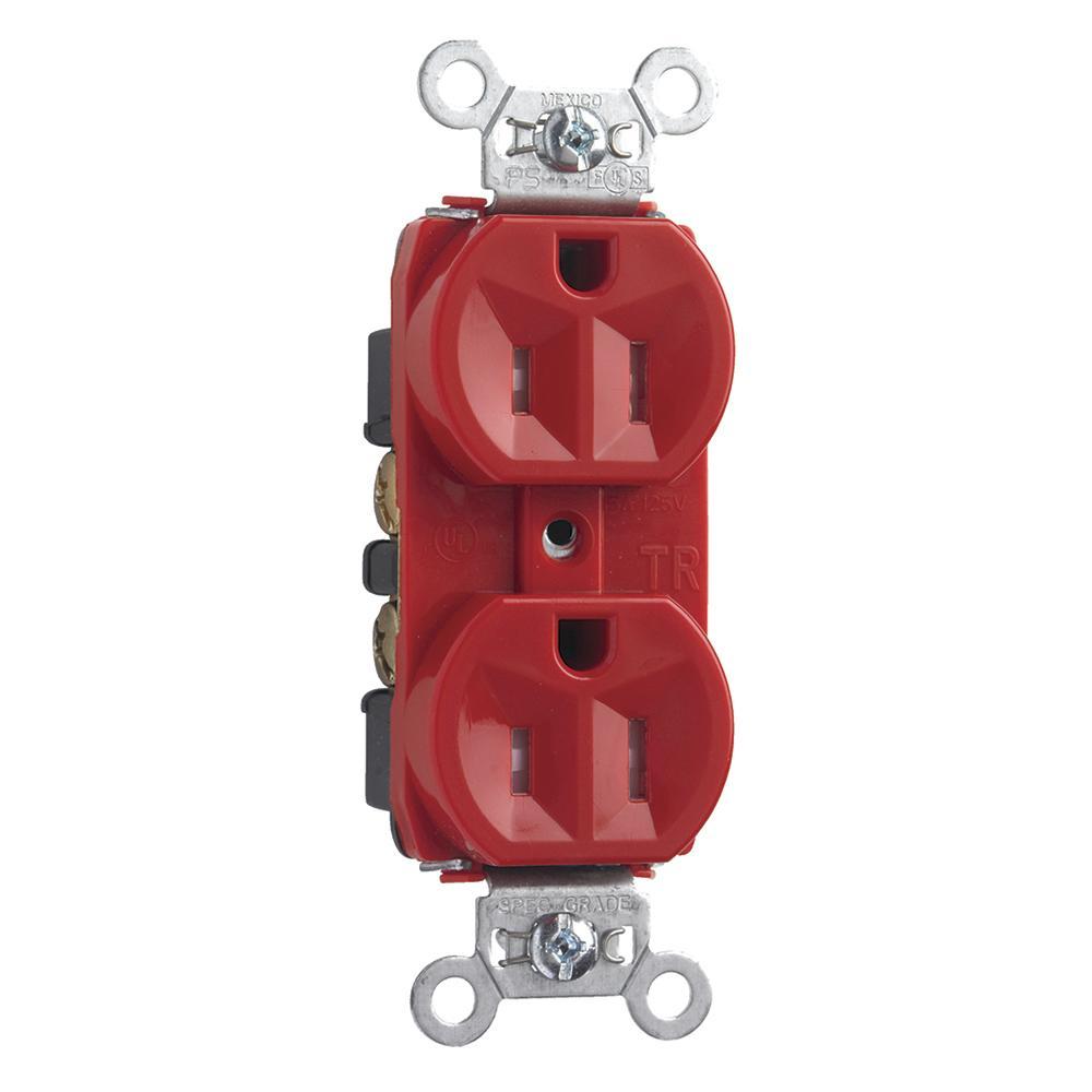 Pass & Seymour® Straight Blade Receptacle, 3-Phase Duplex Tamper-Resistant, 125 VAC, 15 A, 2 Pole, 3 Wires, NEMA 5-15R NEMA Rating, Commercial/Specification Grade, -40 to 60 deg C, Back/Side Wire Terminal, Nylon/Thermoplastic, Red, 5.13 in H x 2 in W x 1.4 in D Dimensions