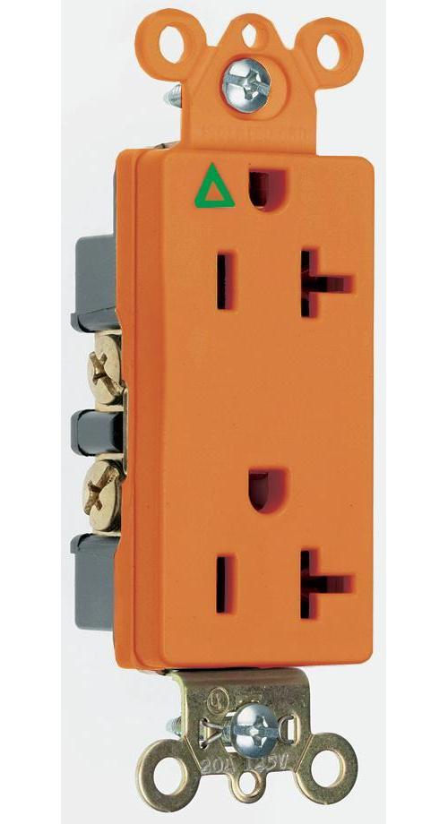 Pass & Seymour® Straight Blade Receptacle, Decorator Duplex Heavy Duty Isolated Ground, 125 VAC, 20 A, 2 Pole, 3 Wires, NEMA 5-20R NEMA Rating, Commercial/Specification Grade, -40 to 60 deg C, Back/Side Wire Terminal, Nylon, Orange, 1.322 in L x 0.833 in W x 3.813 in H Dimensions