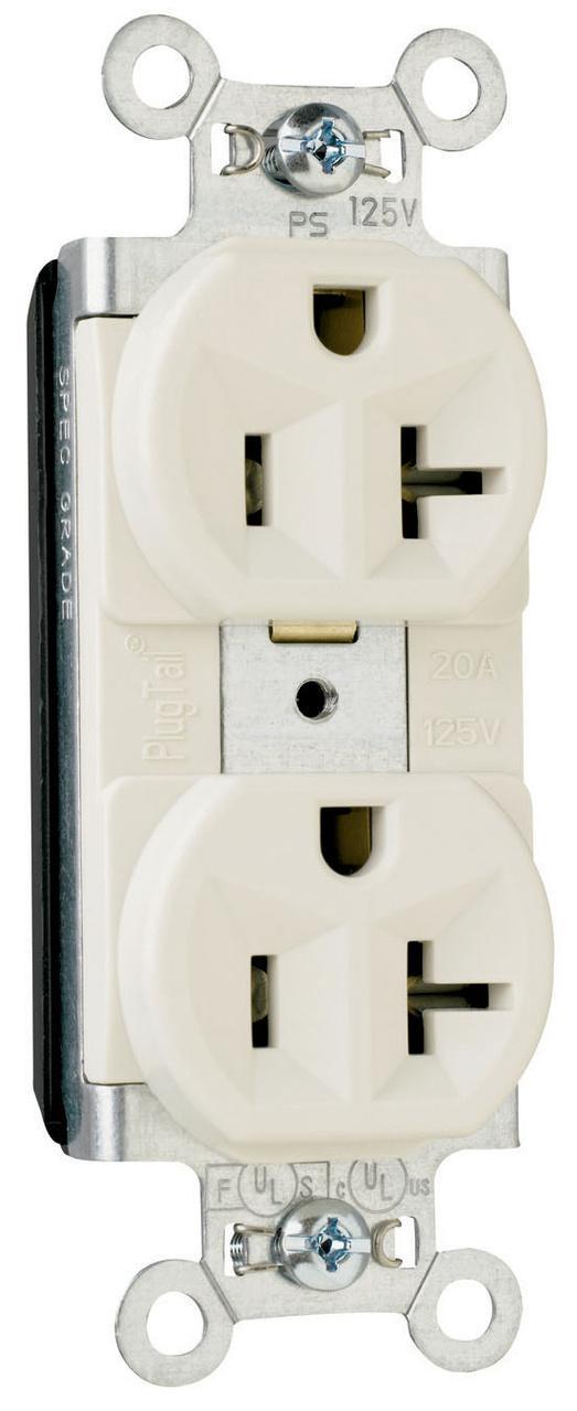 Pass & Seymour® PlugTail® PT5362LA Duplex Straight Blade Receptacle, 125 VAC, 20 A, 2 Poles, 3 Wires, Light Almond