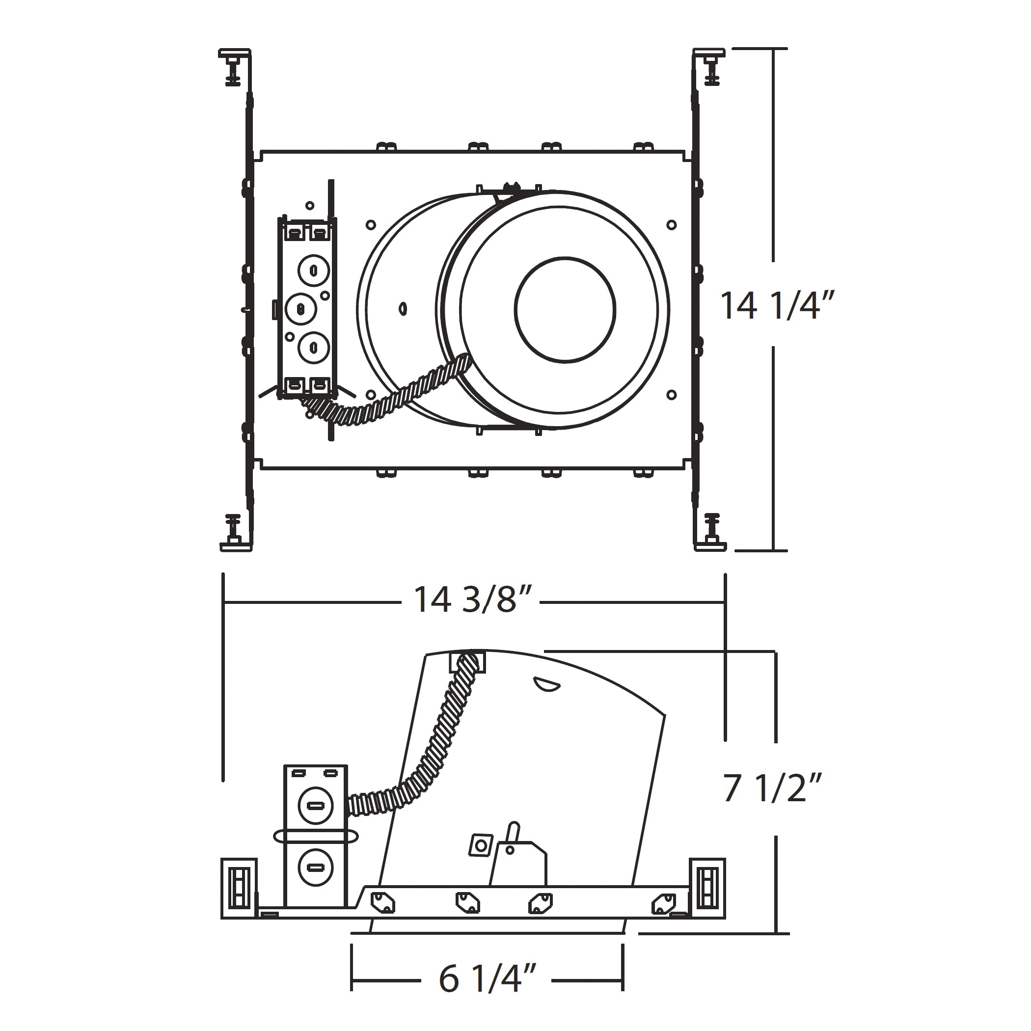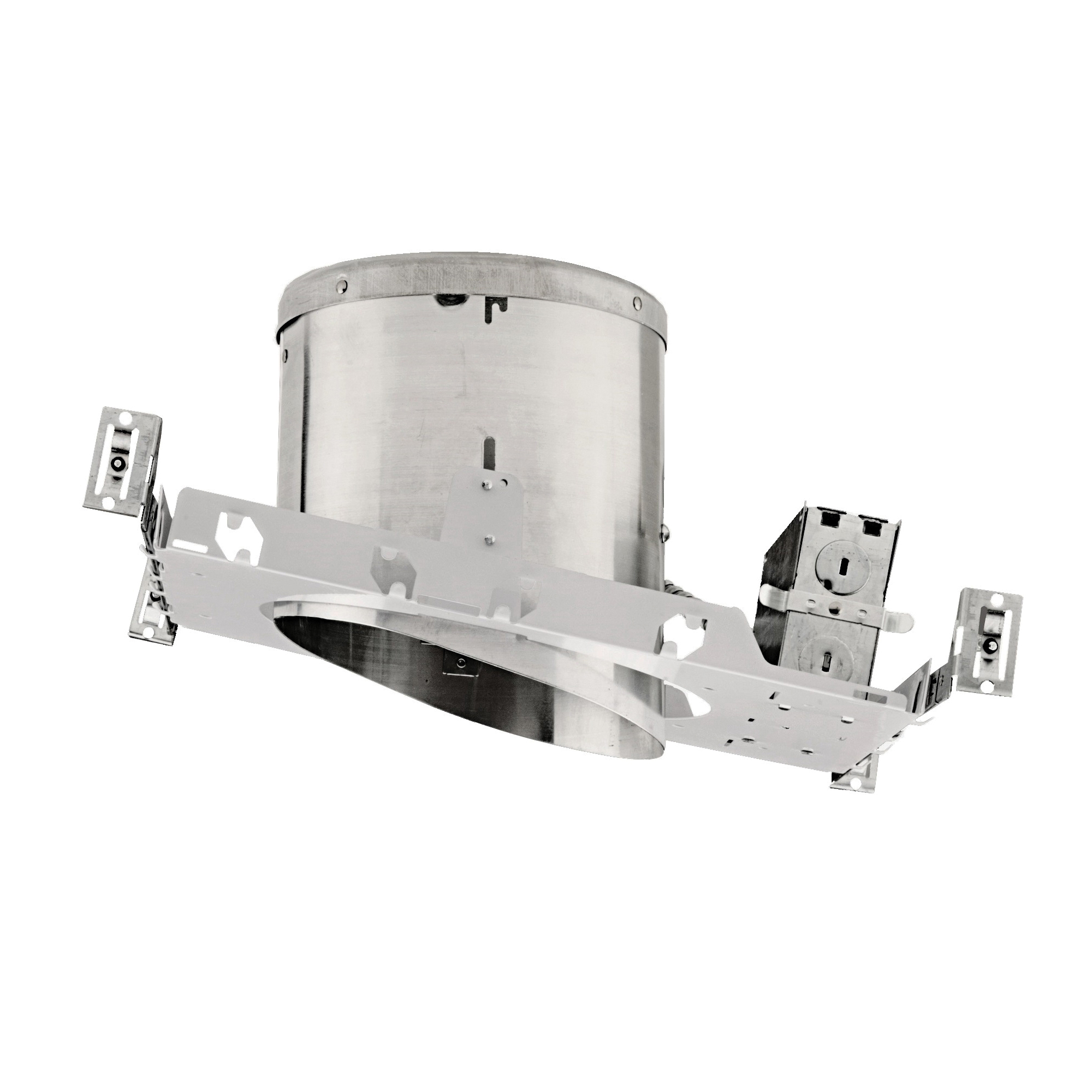 This 6 in IC rated housing is suitable for new construction in residential and commercial applications and for direct contact with insulation. Integral thermal guards protect against improper lamping and misuse of insulation materials with lamp wattage ratings and apertures based off trim selection. Designed for slope ceiling installation with a 2/12 to 6/12 pitch, the socket pivots to allow the lamp to be aimed straight down regardless of ceiling pitch. The airtight housing limits the exchange of air between ceiling plenum and heated/cooled areas. The housing adjusts from 1/2 to 1-1/2 in to accommodate ceiling thickness and its 7-1/2 in height allows it to be used in 2 x 8 in joist construction.
