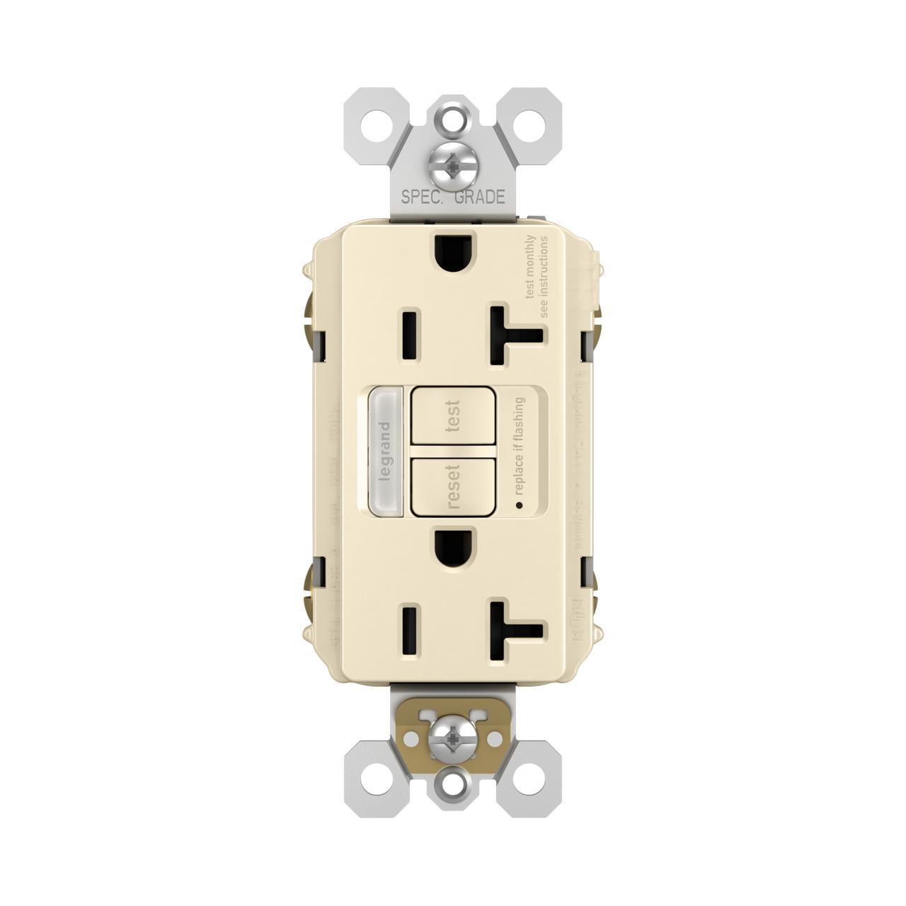 Pass & Seymour® Radiant® TradeMaster® GFCI Receptacle, Combination Self-Test Tamper-Resistant, Series: 2097N, 125 VAC, 20 A, 1 hp, 60 Hz Frequency, 2 Pole, 3 Wires, NEMA 5-20R NEMA Rating, Specification Grade, -35 to 66 deg C, Back/Side Wire Terminal, Thermoplastic, Light Almond, 1.03 in L x 1.73 in W x 4.2 in H Dimensions