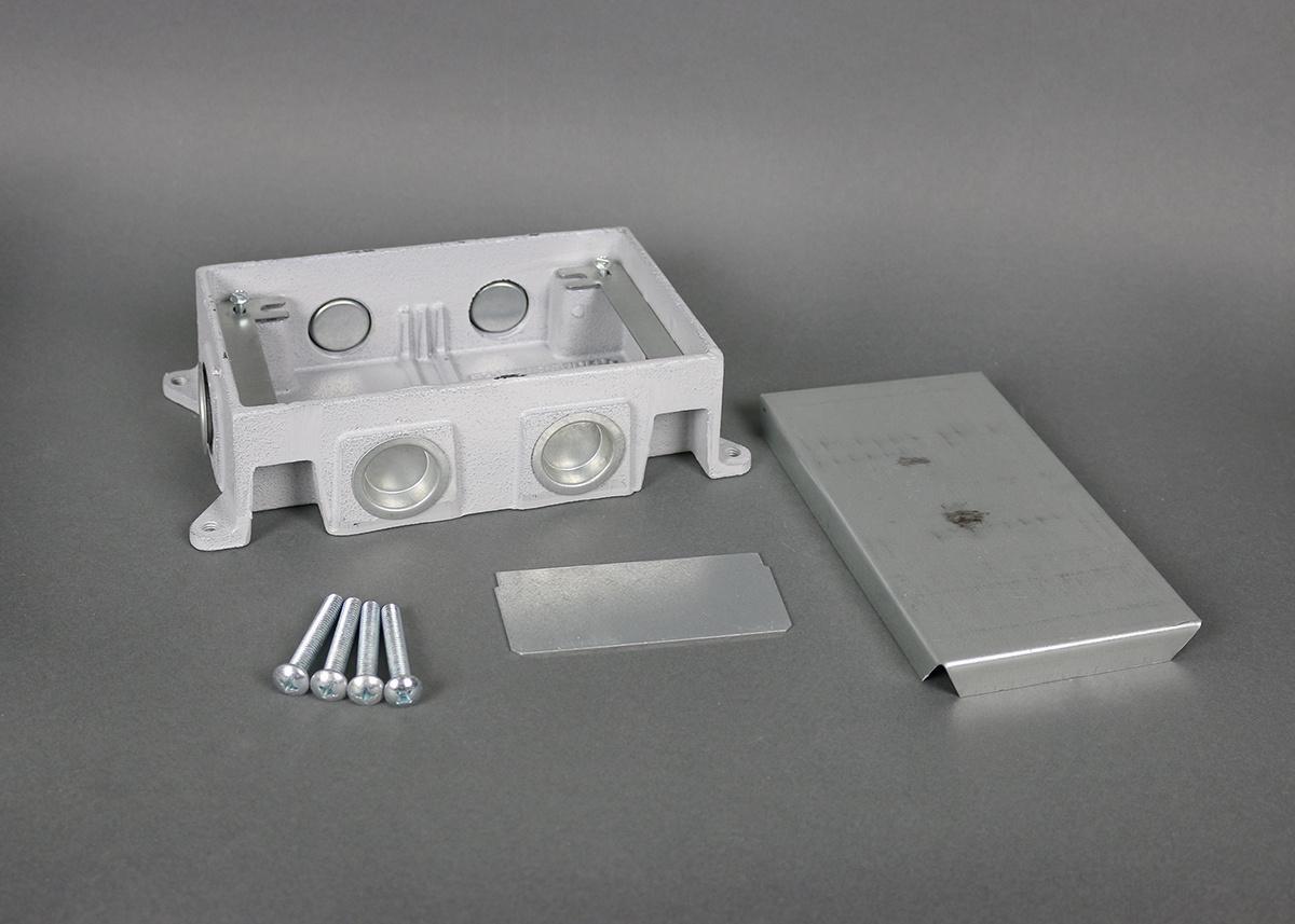 Wiremold® Floor Box, Fully Adjustable Shallow Triple Service, Series: Omnibox™ Series, 2 Gangs, 6 Knockouts, 1 in Knockout, Concrete/Floor Mounting, 76 cu-in Capacity, Cast Iron, 8-1/2 in L x 4-3/8 in W x 2-7/16 in H Dimensions