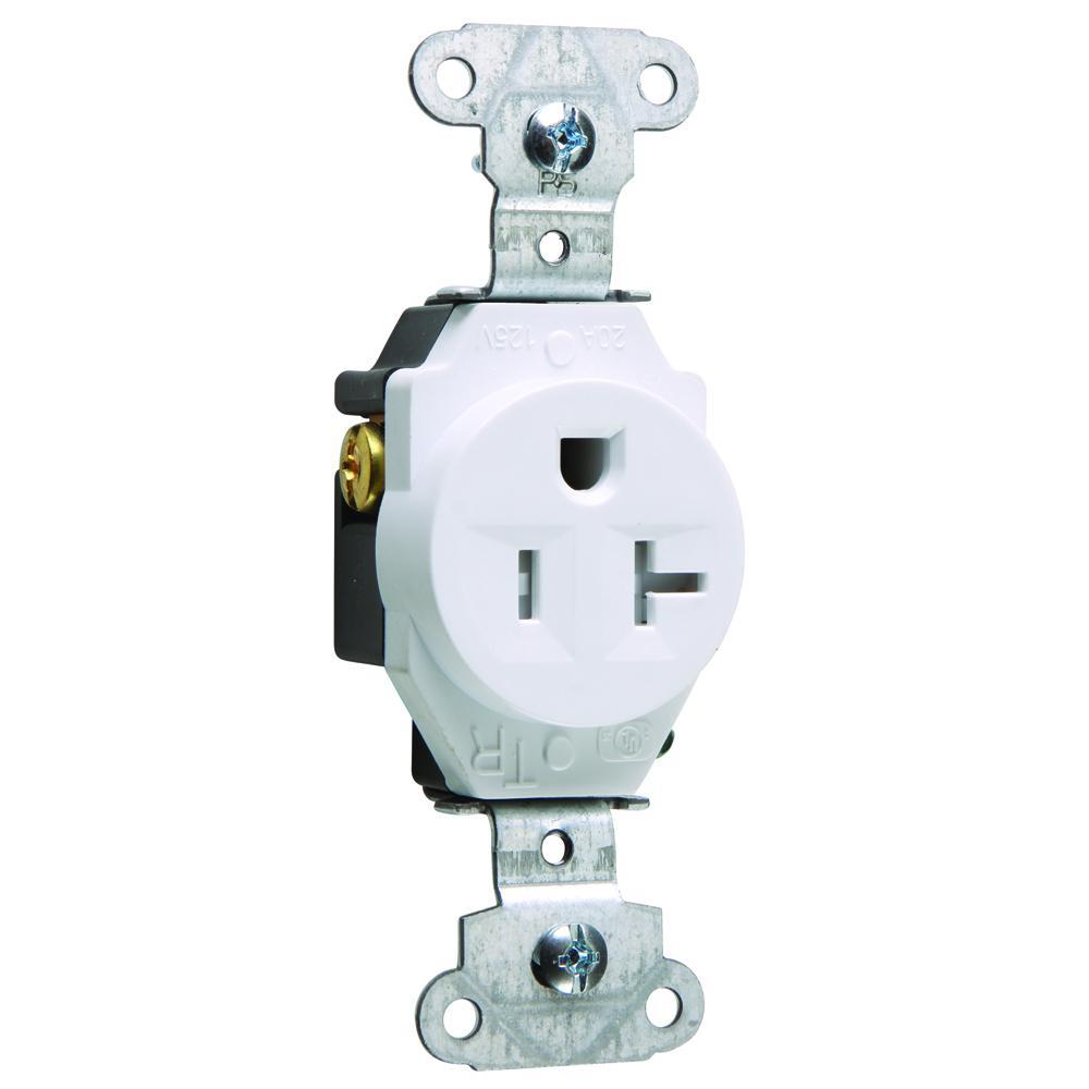 Pass & Seymour® Straight Blade Receptacle, Single Tamper-Resistant, 125 VAC, 20 A, 2 Pole, 3 Wires, NEMA 5-20R NEMA Rating, Commercial/Specification Grade, Back/Side Wire Terminal, Thermoplastic, White, 3.3 in H x 1.29 in W x 1.19 in D Dimensions