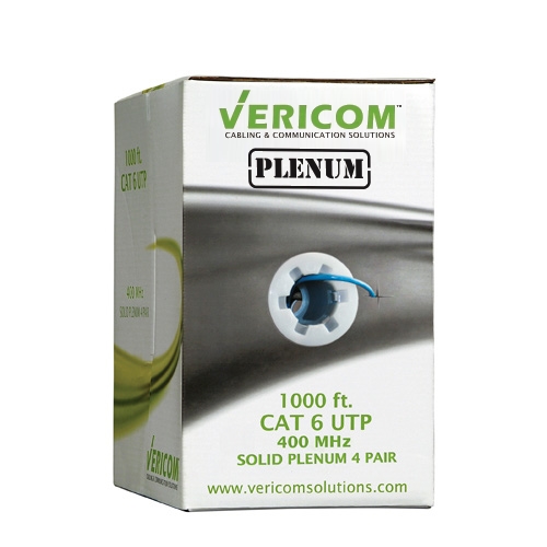 Vericom offers these 1000 ft 23 AWG pull boxes of Cat 6 U/UTP 400 MHz plenum rated cable at unbeatable prices. This UL/CSA, RoHS CMP compliant premise cable has solid copper conductors and differential twisted pairs to reduce crosstalk. This Cat 6 Ethernet networking cable comes stored in a pull box to aid in wiring installations.