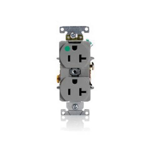Leviton®, 8300-HGY, Straight Blade Duplex Receptacle, Heavy Duty Slim Body, 125 VAC, 20 A, 1 hp, 2 Pole, 3 Wires, NEMA 5-20R NEMA Rating, Hospital Grade, NEMA WD-1/WD-6 Enclosure, -40 to 60 deg C, Back/Side Wire Terminal, Thermoplastic, Gray, 4.06 in H x 1.51 in W x 1.18 in D Dimensions