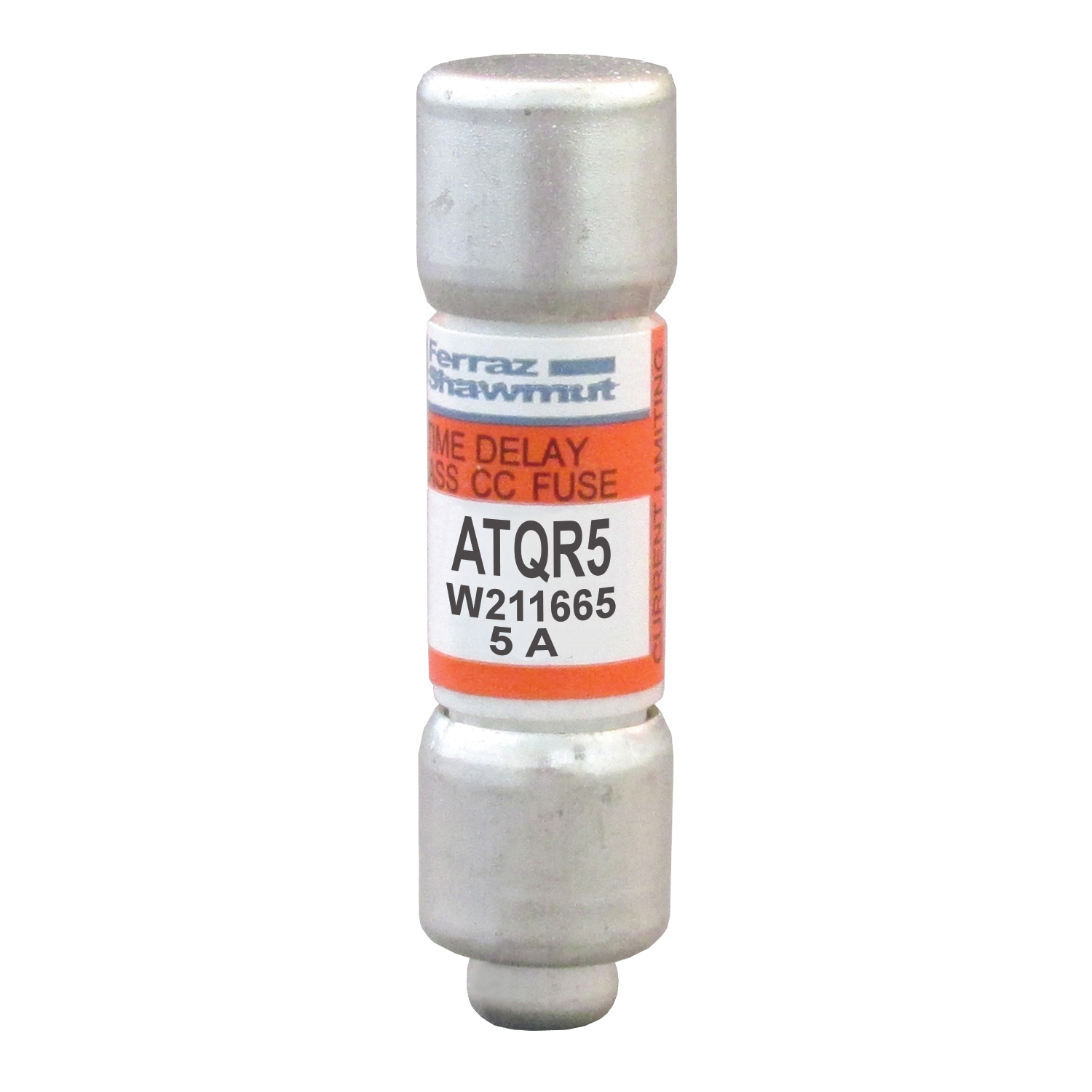Mersen Amp-Trap® 2000 SmartSpot® Power Fuse, Current Limiting Low Voltage North American Time Delay, Series: ATQR, Non-Indicating, Rejection, 5 A, 600 VAC, 200 kA Interrupt, Class: CC, Ferrule Terminal, Clip Mounting, Cylindrical Body, Dual Element, Fiberglass, 13/32 in Dia x 1-1/2 in L Body