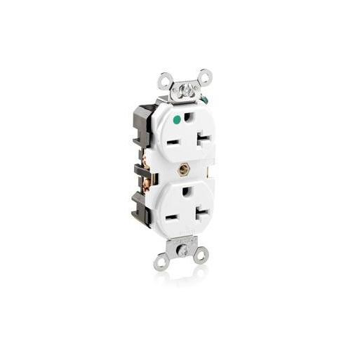 Leviton® Straight Blade Receptacle, Duplex Extra Heavy Duty Wide Body, 250 VAC, 20 A, 2 hp, 2 Pole, 3 Wires, NEMA 6-20R NEMA Rating, Commercial Grade, -40 to 60 deg C, Back/Side Wire Terminal, Thermoplastic, White, 46 in H x 1.53 in W x 1.11 in D Dimensions