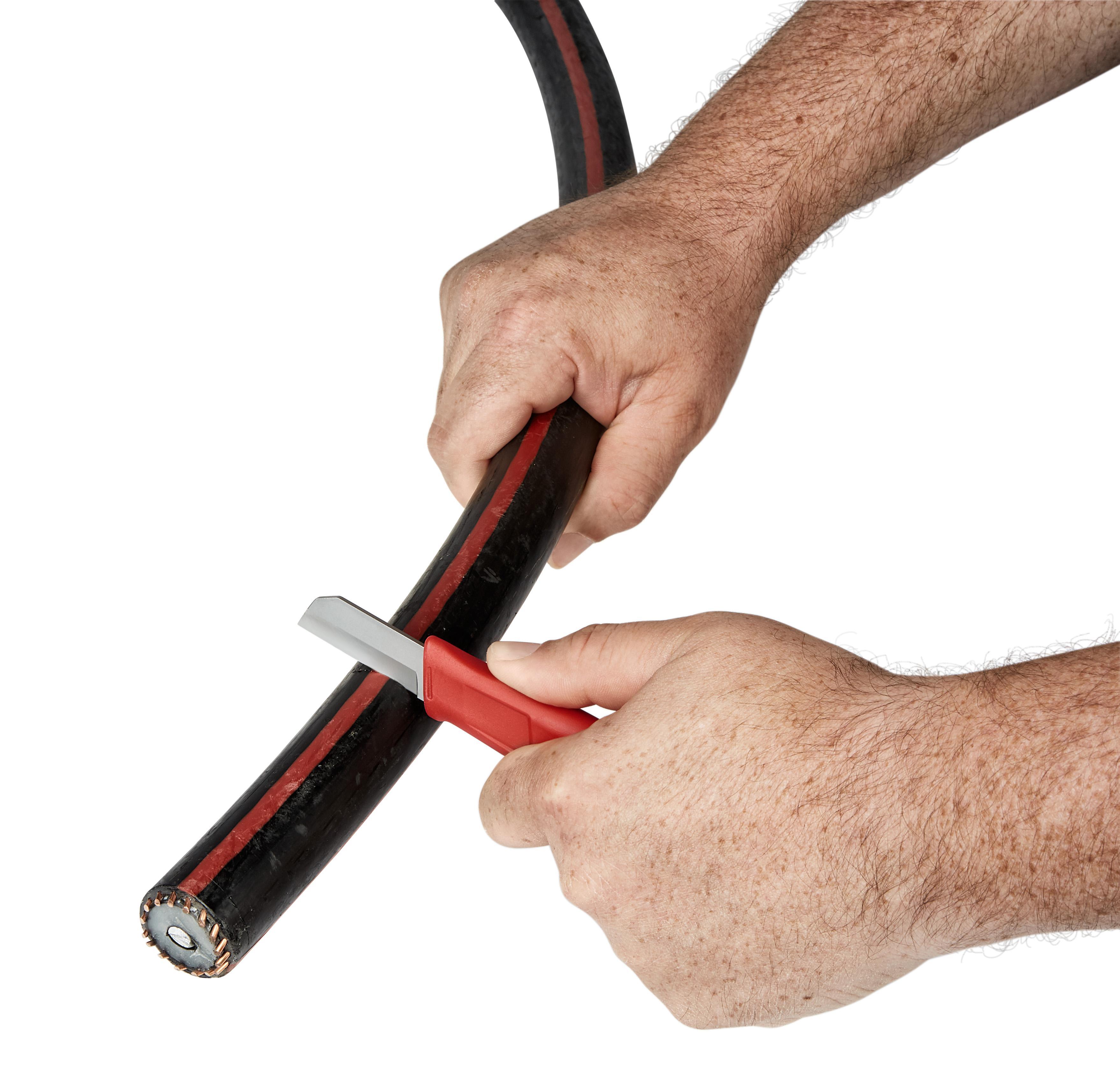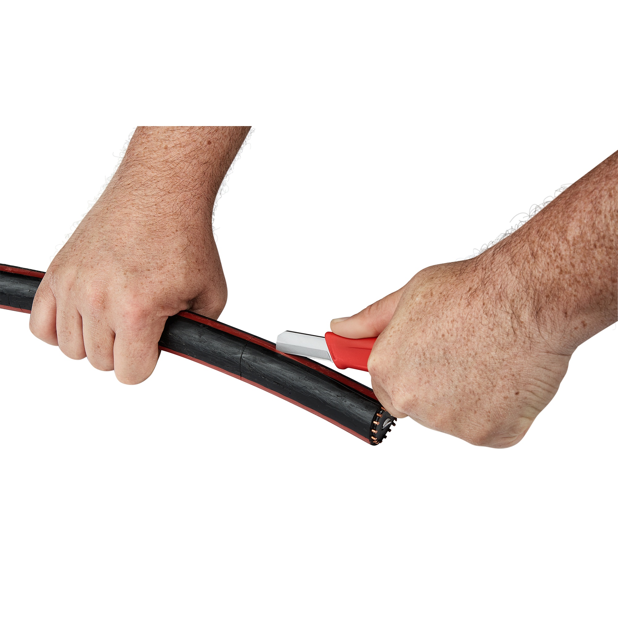 The Milwaukee® lineman's underground knife is ideal for stripping multi-layer wire and cable. The stainless steel blade is optimized to stay sharper longer. The ergonomic handle is designed for all day use as well as an easy fit in tool pouches. A durable blade cover allows for easy storage and while the knife is in use can be stored in the handle of the tool to prevent loss.