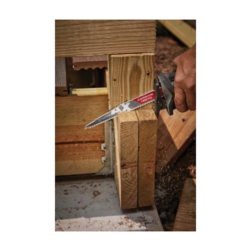 Milwaukee® SAWZALL® AX™ Reciprocating Saw Blade, Tapered Back, 12 in Length, 0.05 in Thickness, 5 TPI, 1/2 in Tang, Universal/Toothed Edge Tang, Carbide Cutting Edge, Carbide Body, Red, Applicable Materials: Composite and Residential Materials, Durock, Nail, Nail Embedded Wood, Plaster, Plywood, Screw, Shingle, Synthetic and Wood