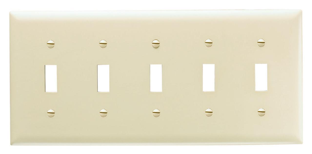 Pass & Seymour®, TradeMaster®, TP5I, Standard Wall Plate, 5 Gangs, 5 Ports, 10 in W x 4.7 in H Size, (1) 15/16 in L x 13/32 in W Toggle Switch Cutout, Orientation: Vertical, Bare Insulation, Wall Mounting, Molded Construction, 0.35 in Thickness, Thermoplastic, Ivory, Smooth