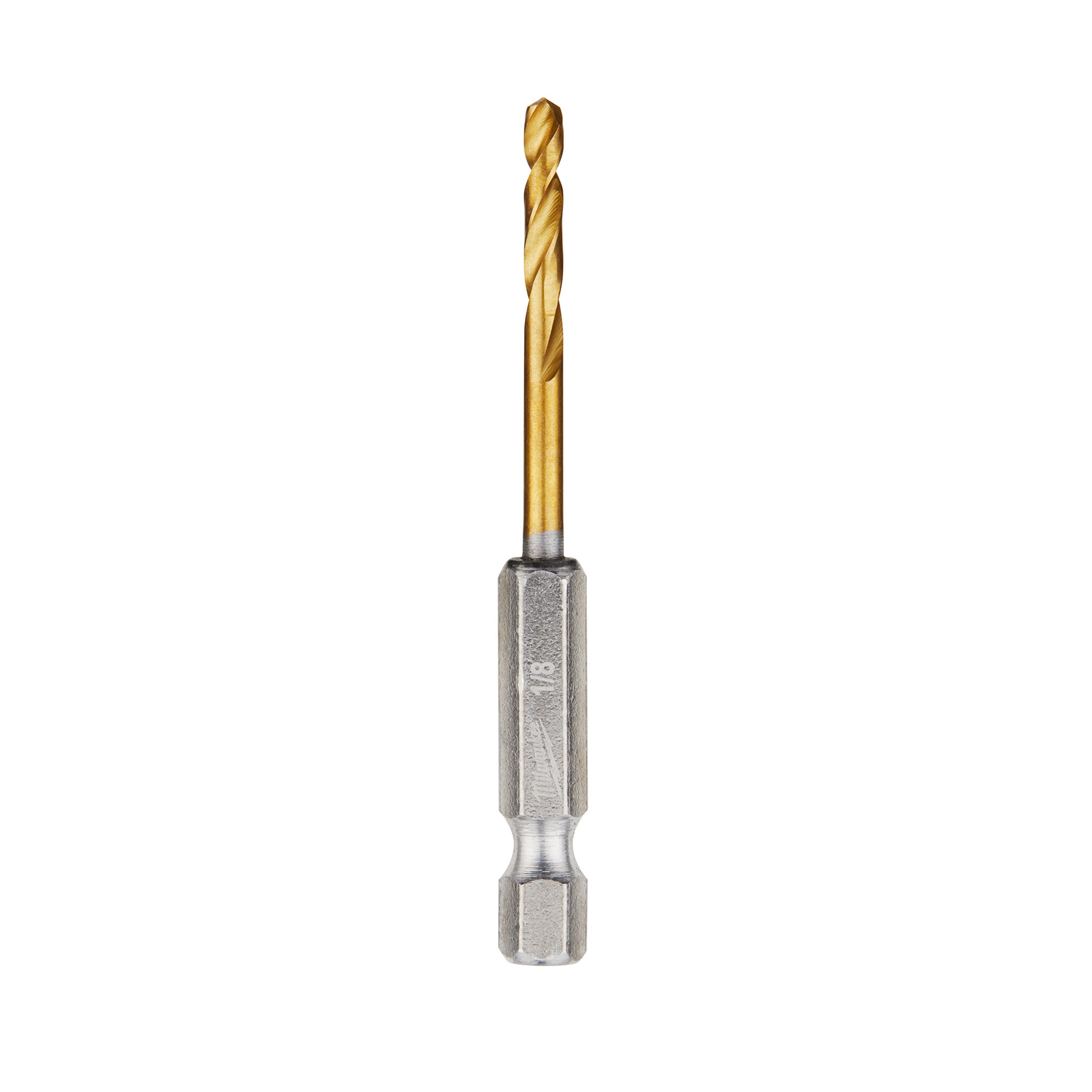 Milwaukee® SHOCKWAVE™ Impact Drill Bit, Hex Shank, 1/8 in Drill - Fraction, 0.125 in Drill - Decimal Inch, 2-5/8 in Overall Length, 29/32 in Cutting Depth, 29/32 in Flute Length, 1/4 in Shank, 135 deg Point, Split Point, HSS Cutting Edge, HSS, Titanium Coated, Applicable Materials: Aluminum, Duct/Sheet Metal, PVC, Steel and Wood